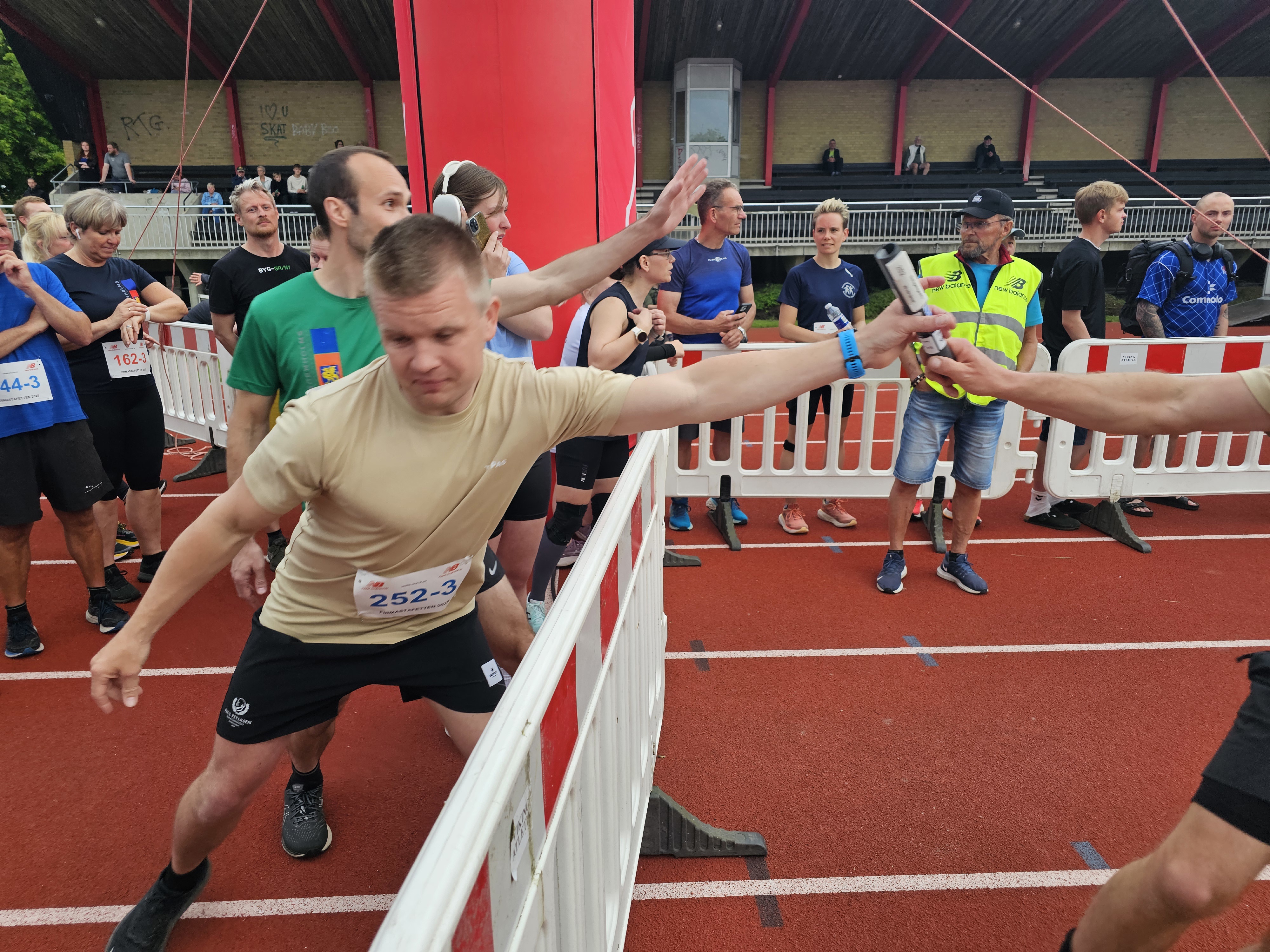 Skiftezonen er inde på Rønne Stadion, hvor mange hundrede tilskuere følger slagets gang.