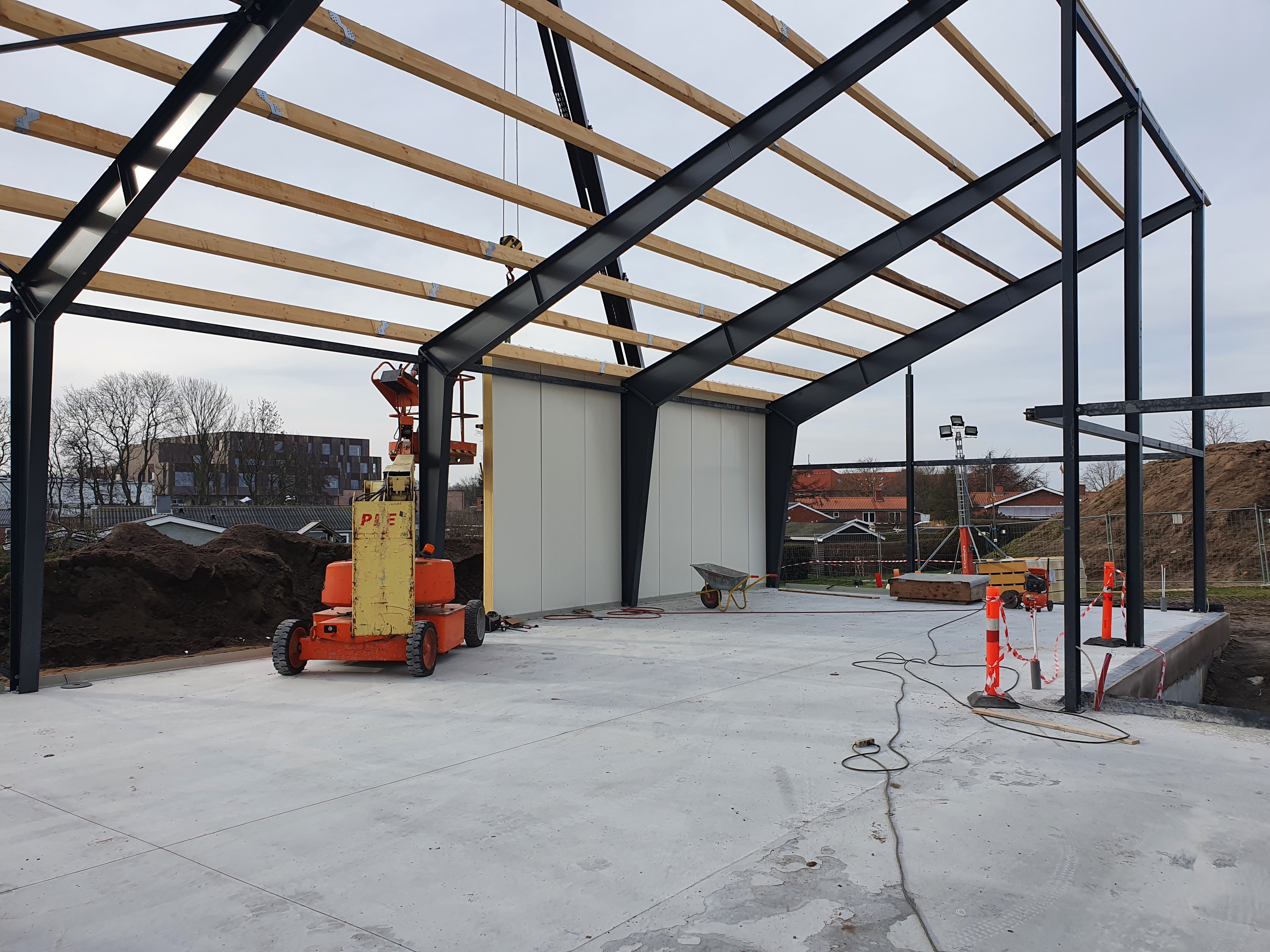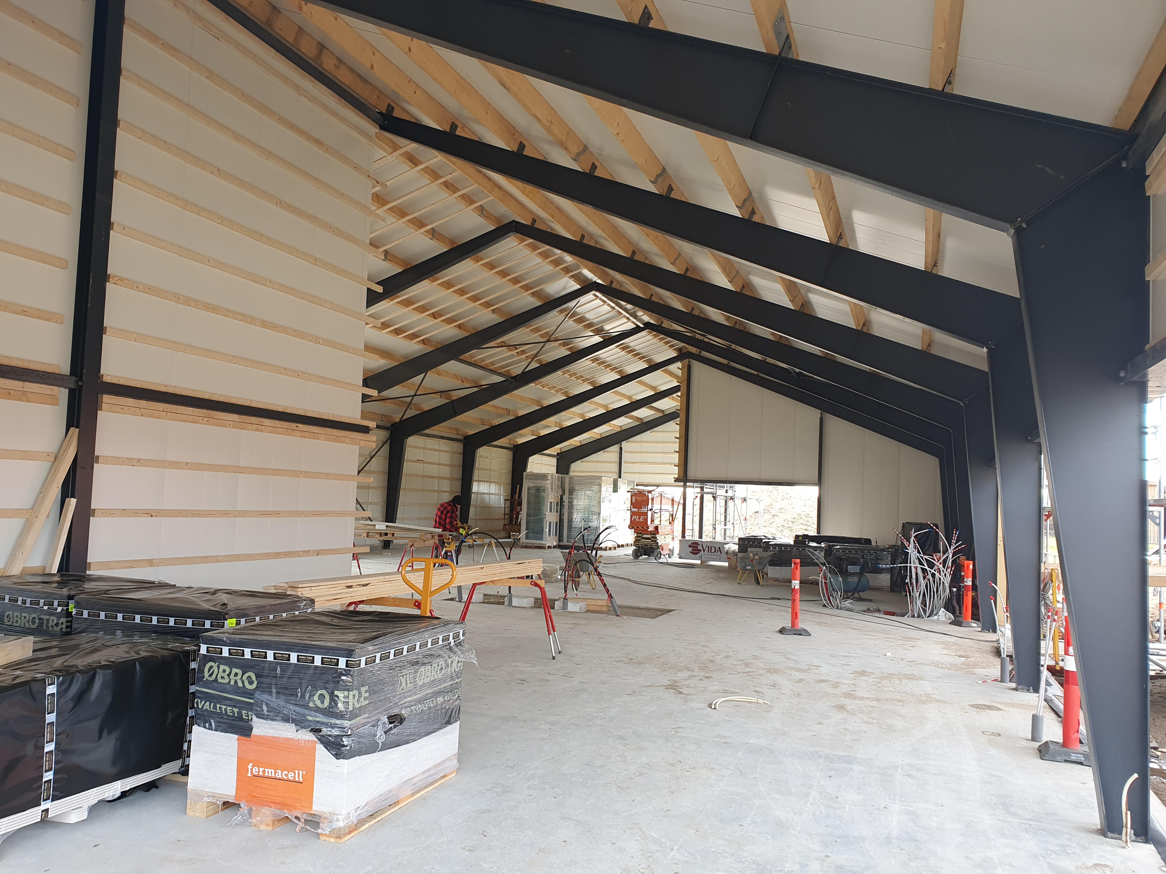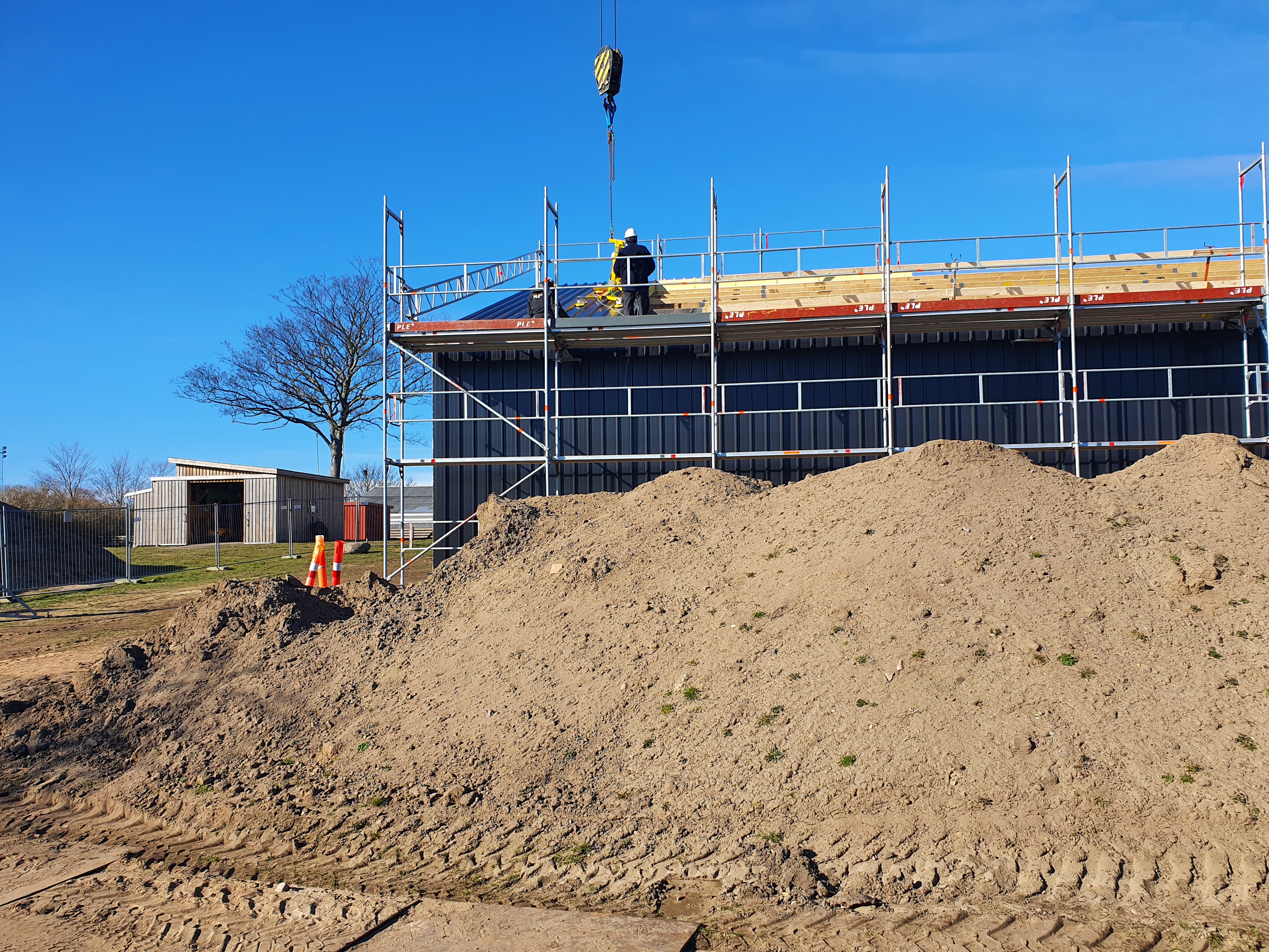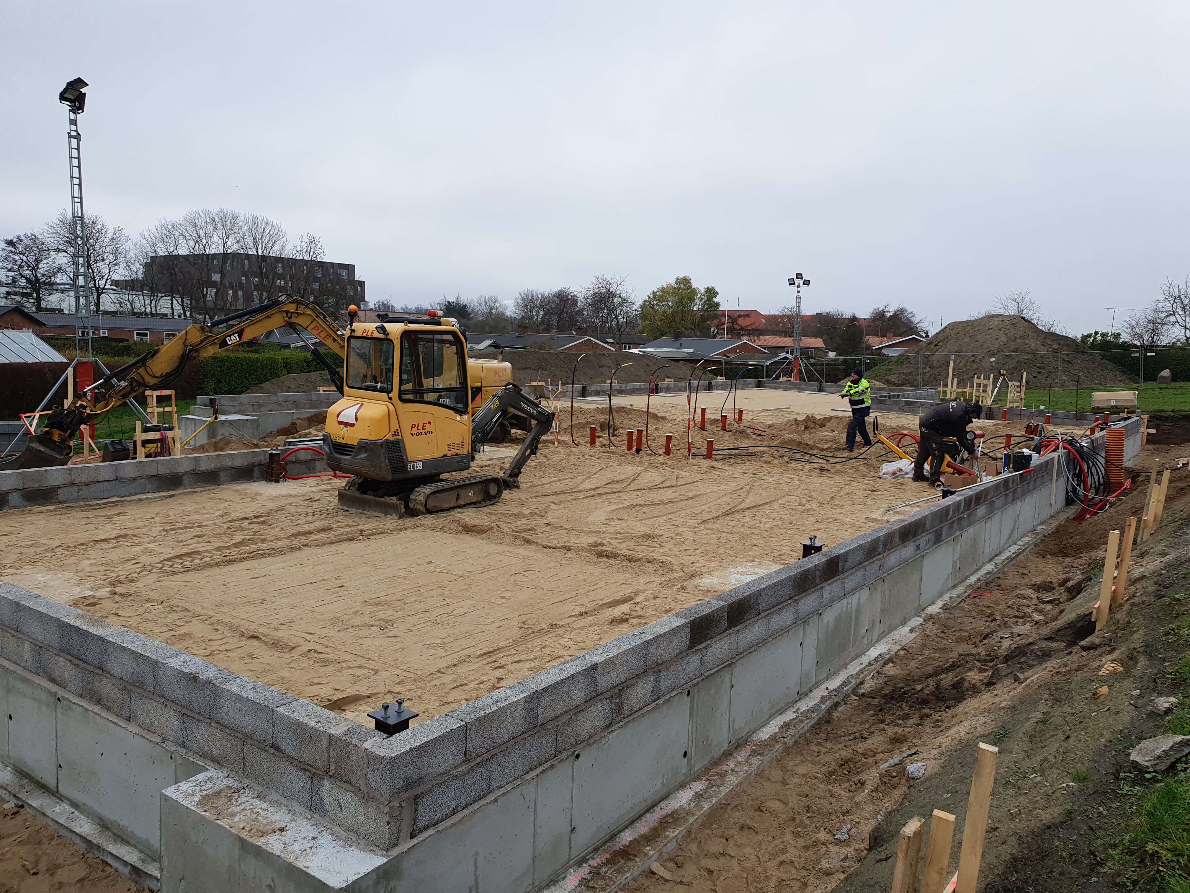 - 4. maj - "Dækket" er færdigt og der påbegyndes opførelse af ventilationsanlæg. Indervægge til omklædningsrum beklædes.