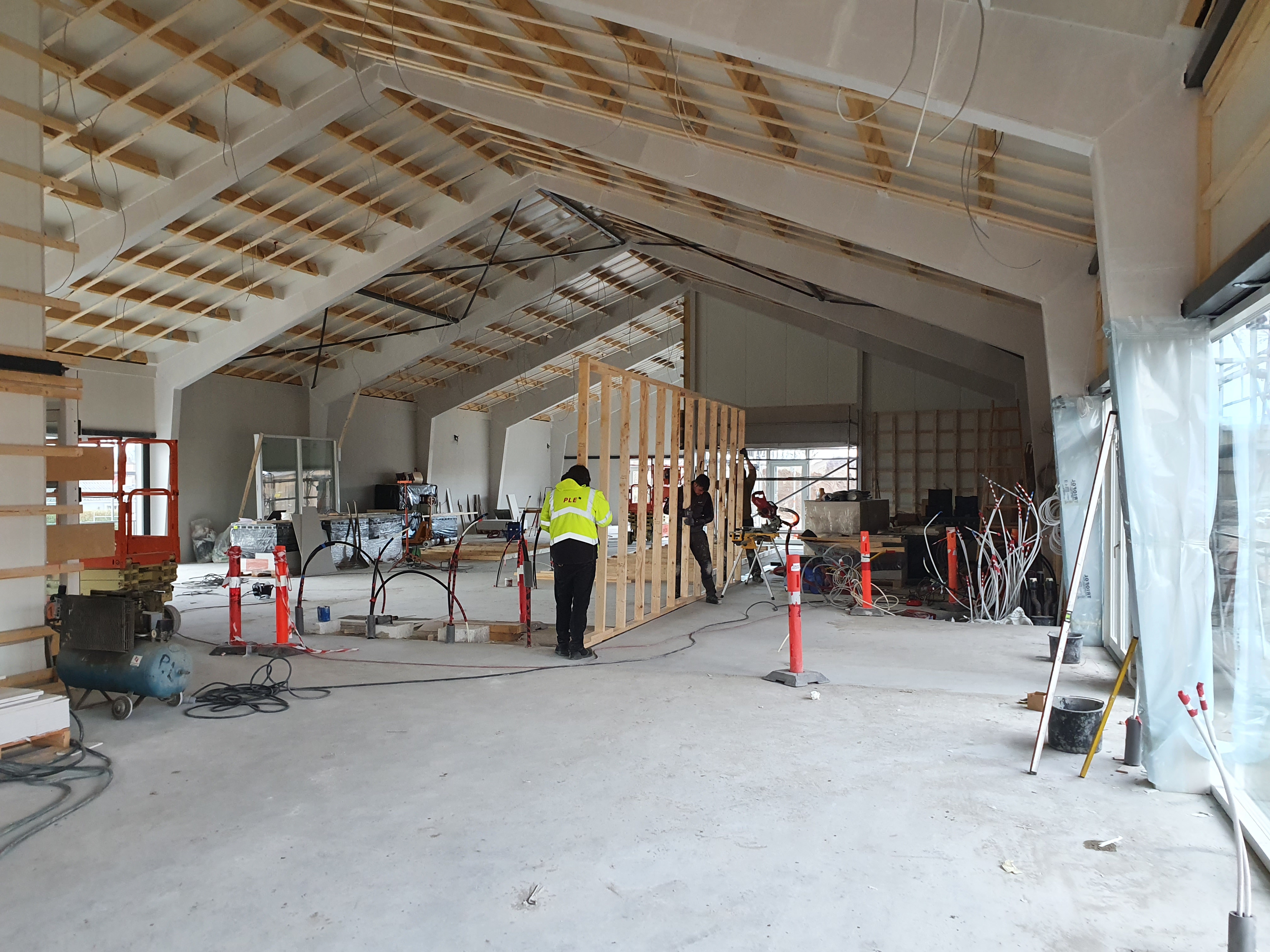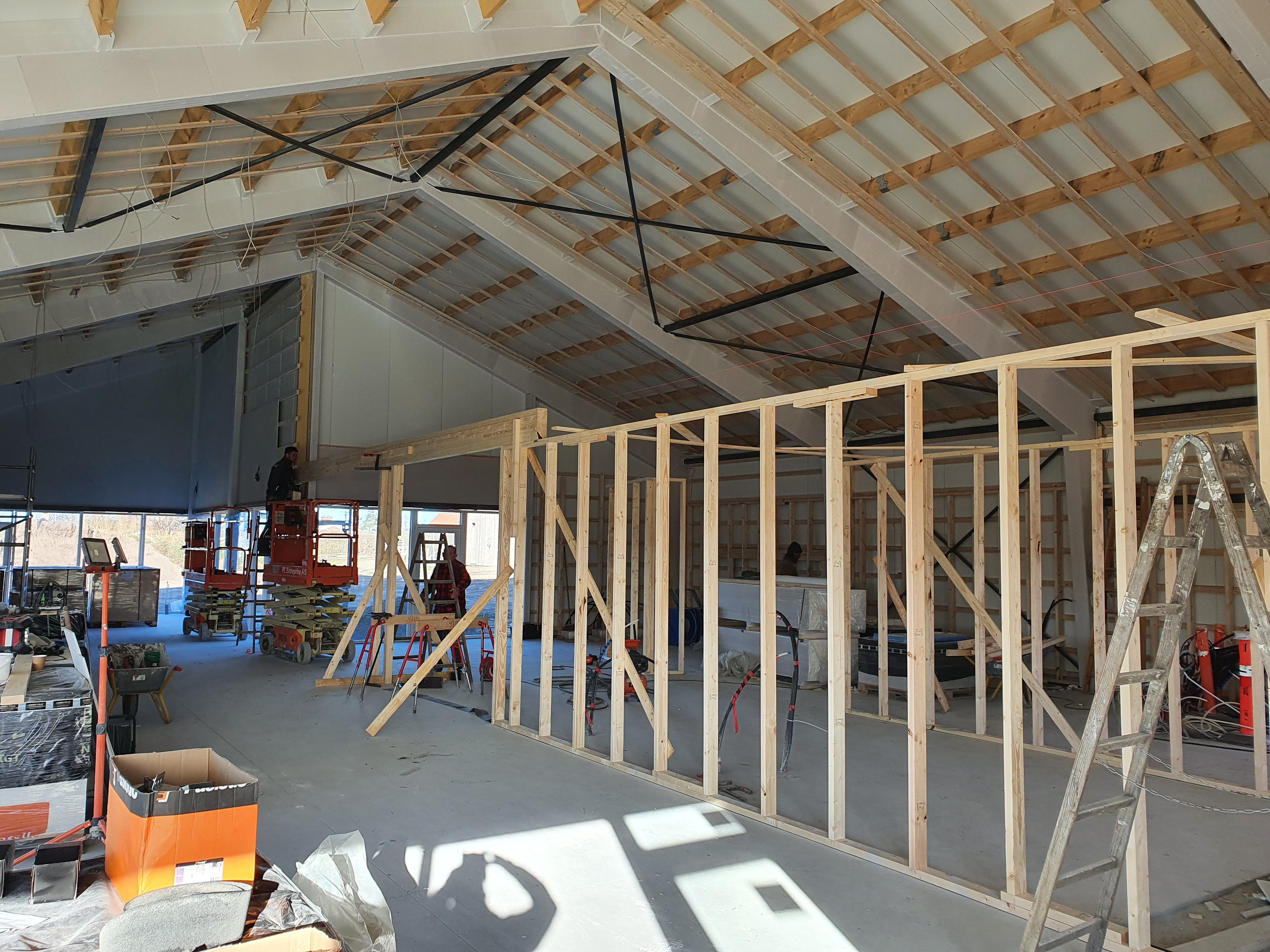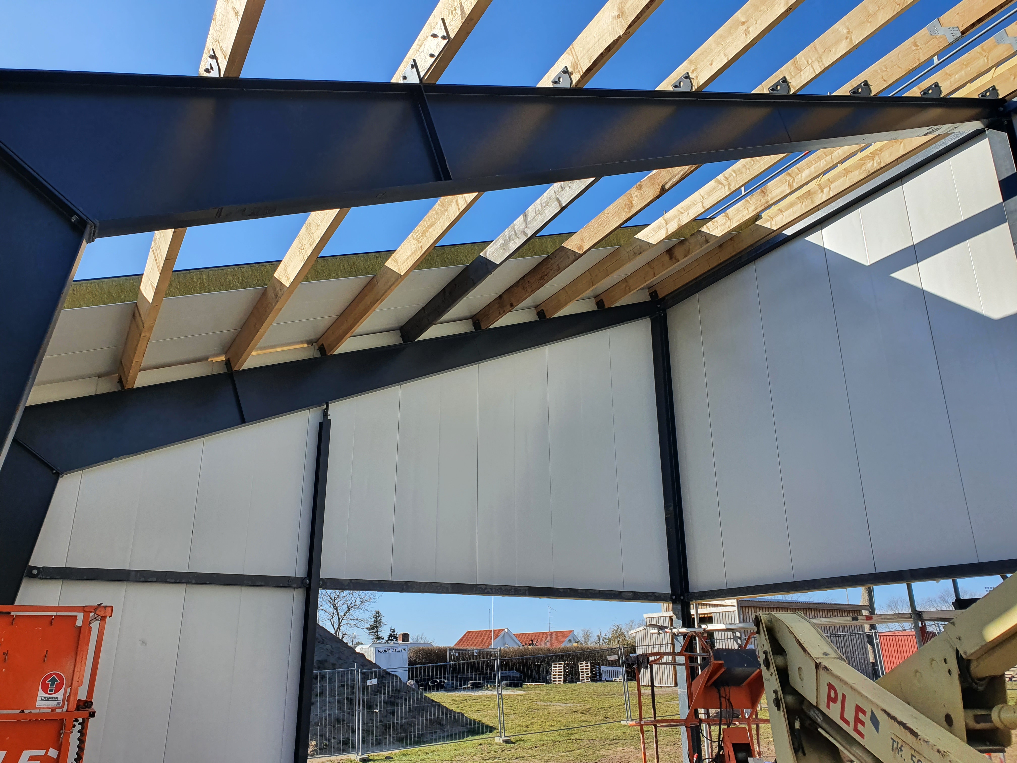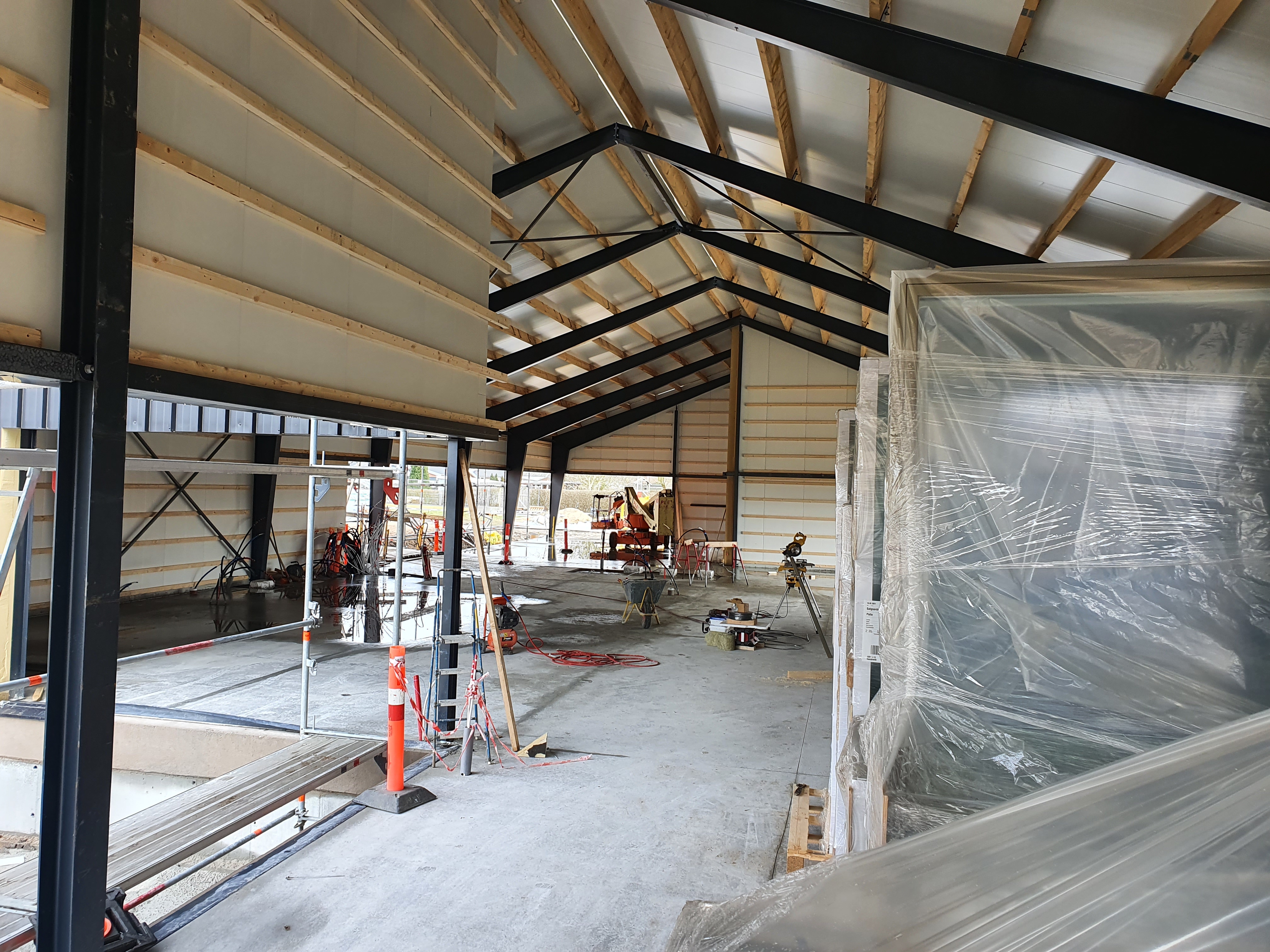 - 4. maj - "Dækket" er færdigt og der påbegyndes opførelse af ventilationsanlæg. Indervægge til omklædningsrum beklædes.