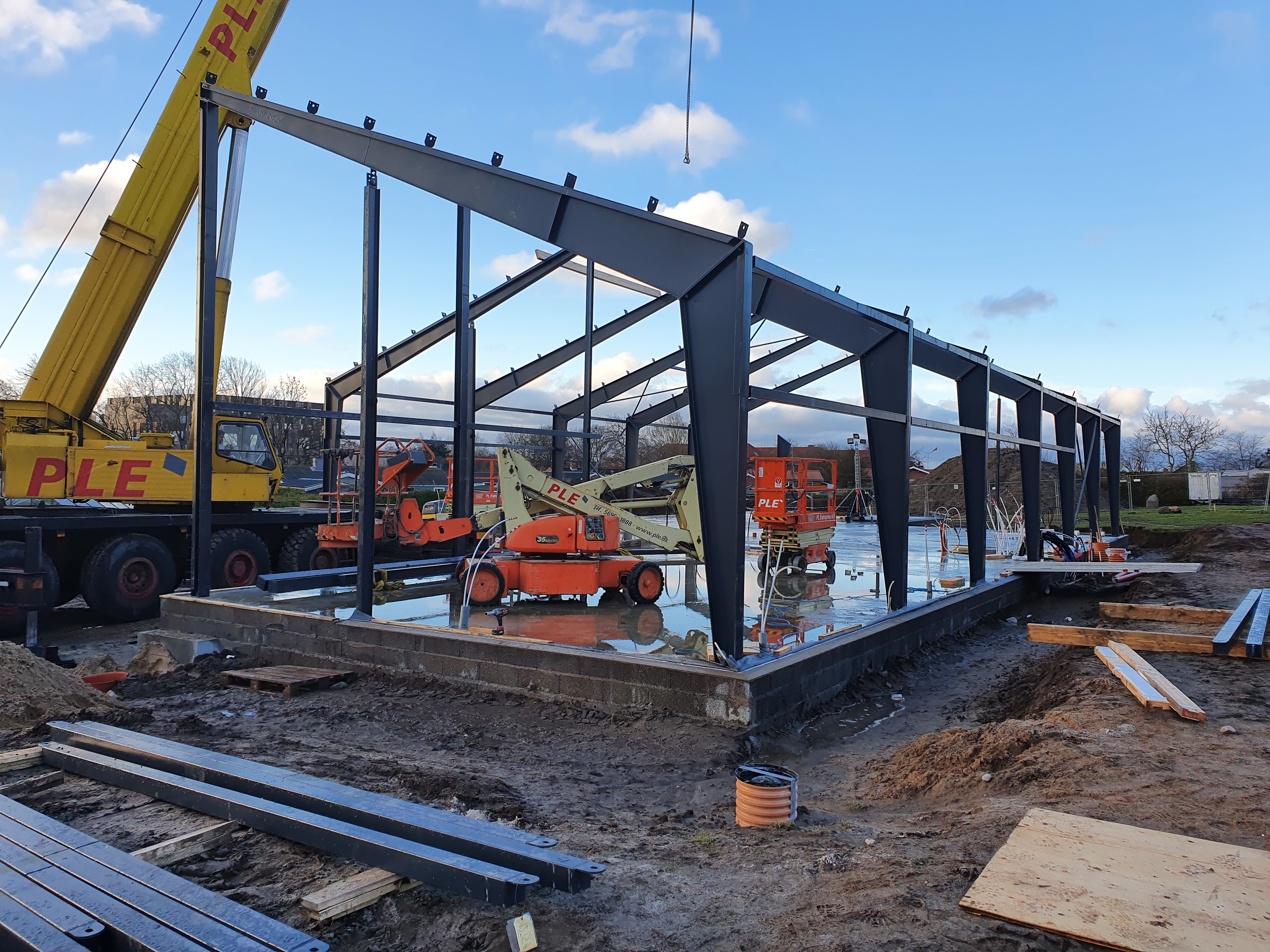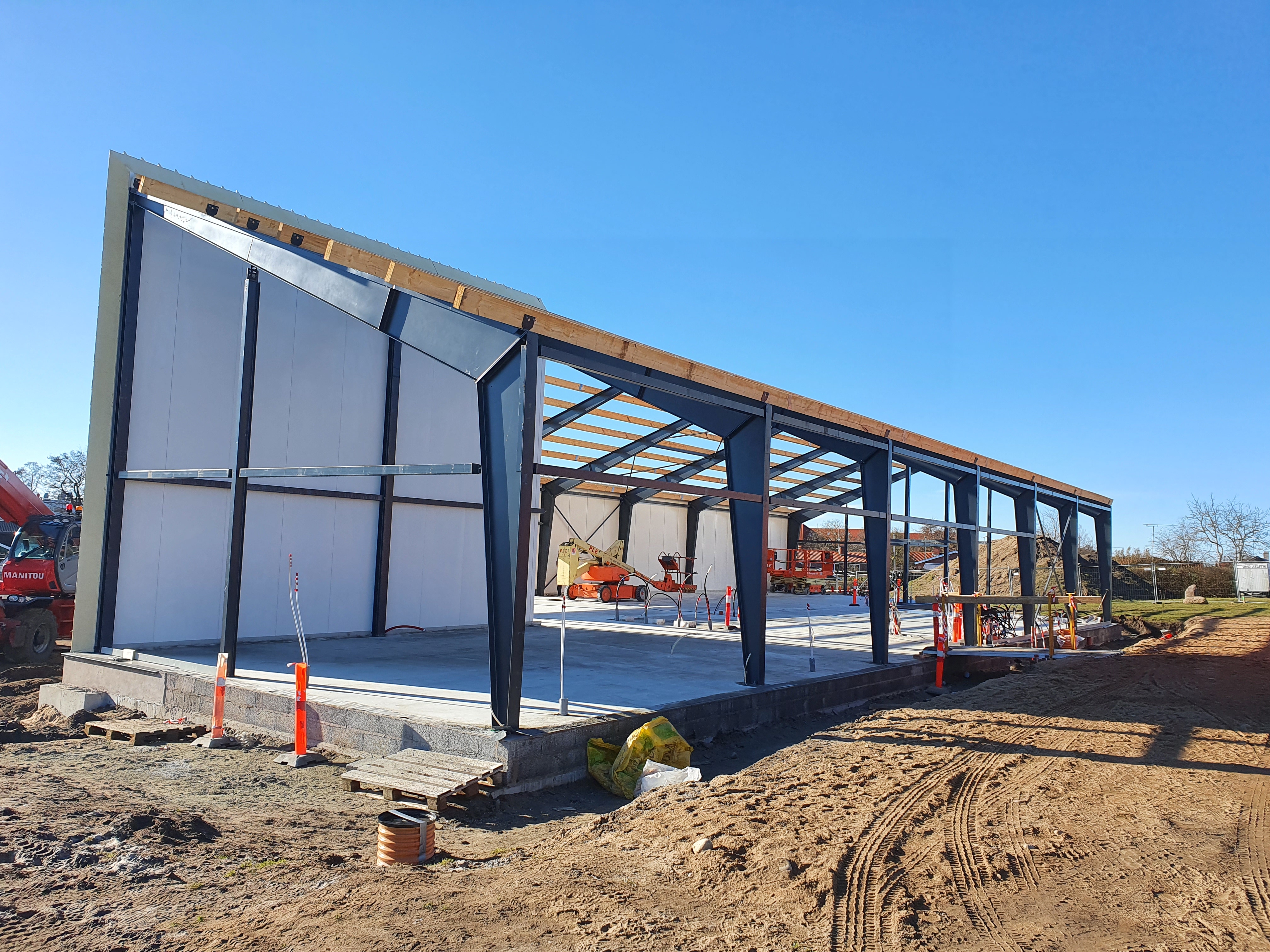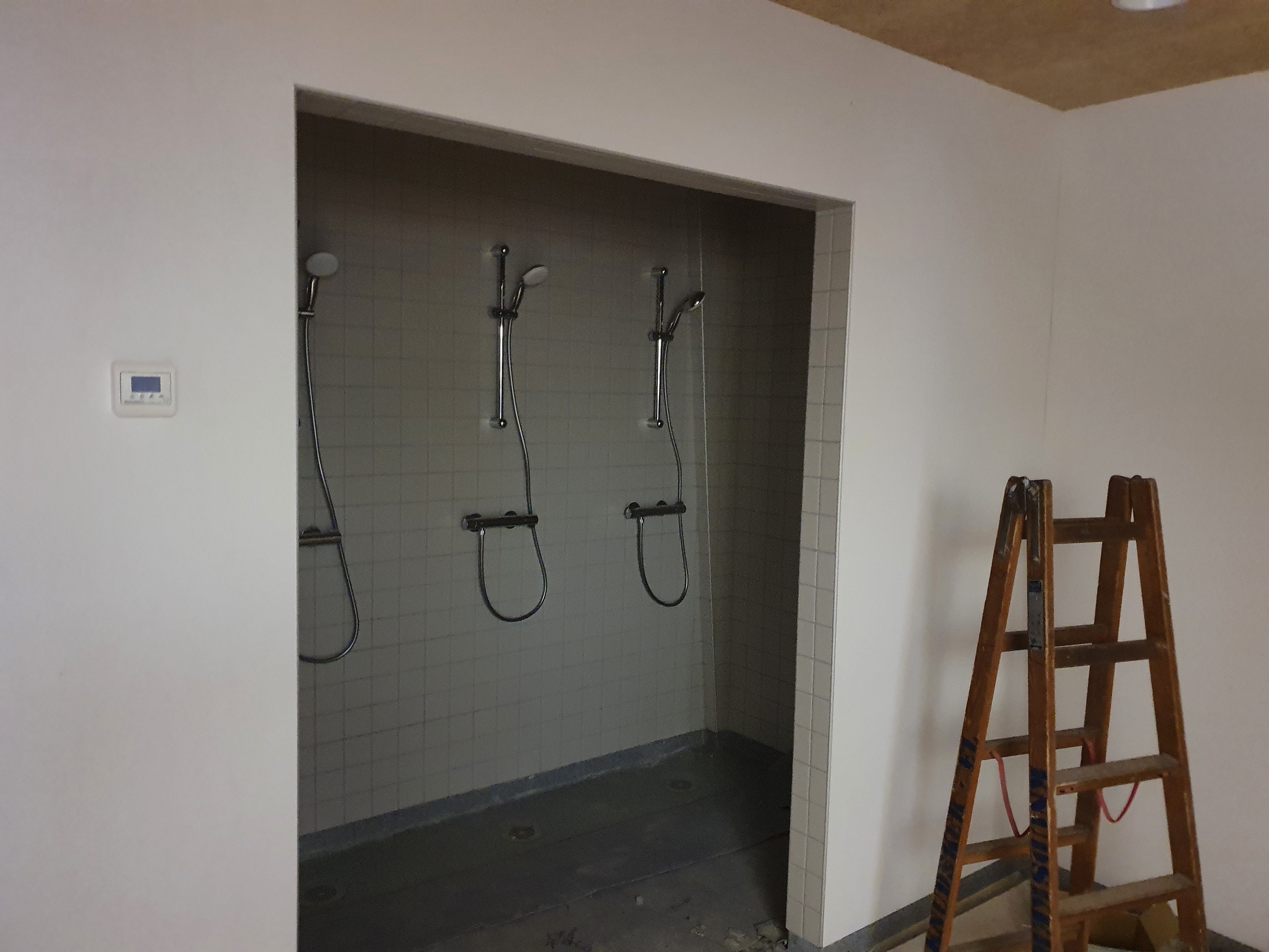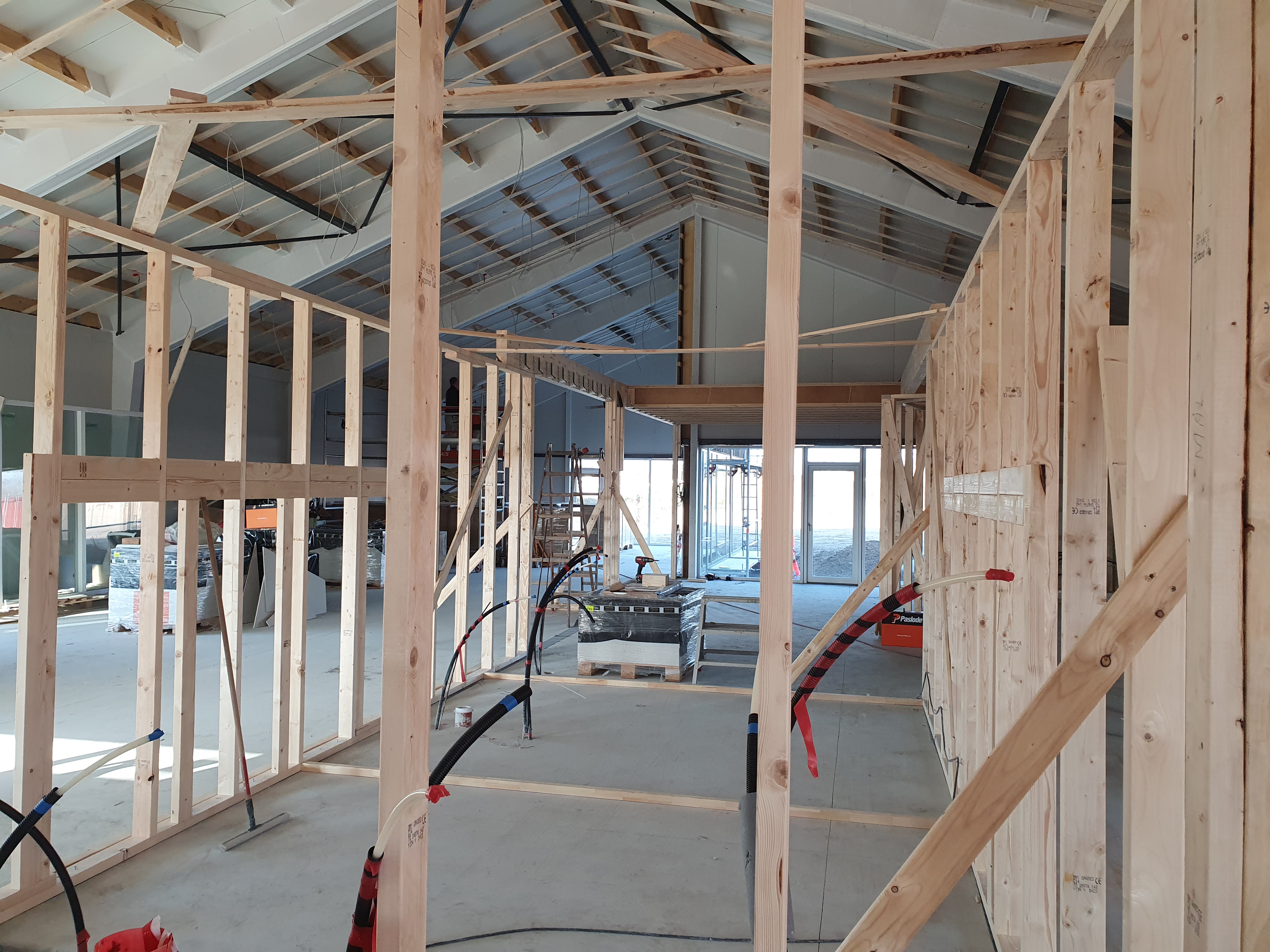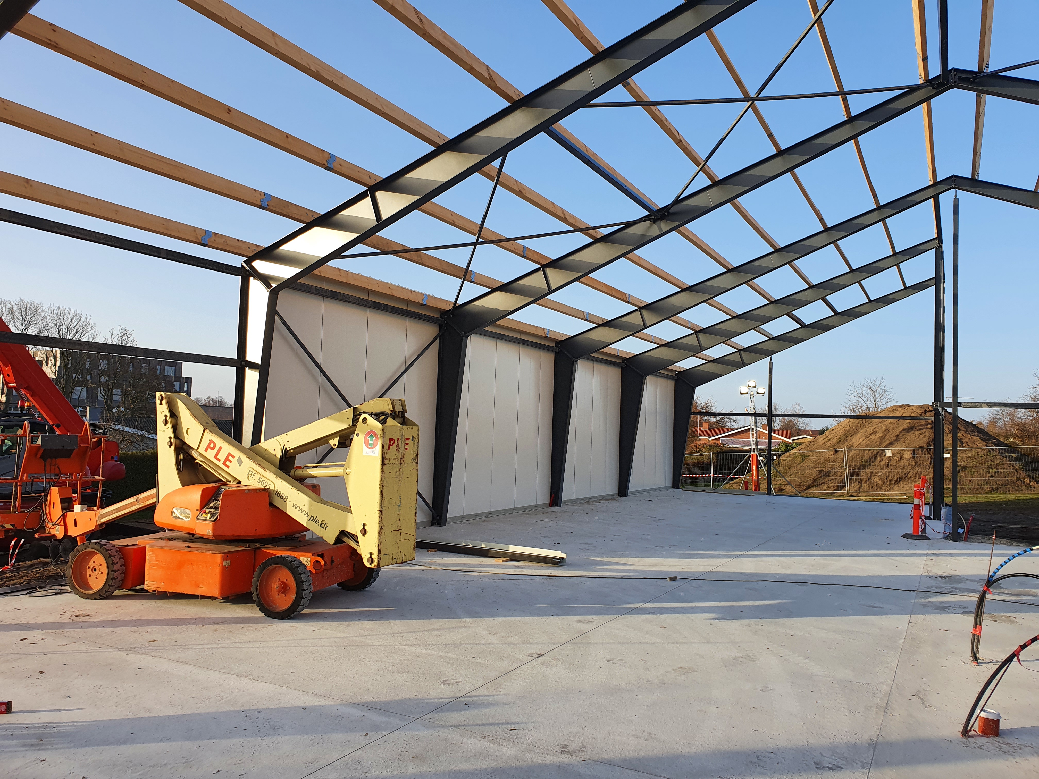 - 4. maj - "Dækket" er færdigt og der påbegyndes opførelse af ventilationsanlæg. Indervægge til omklædningsrum beklædes.