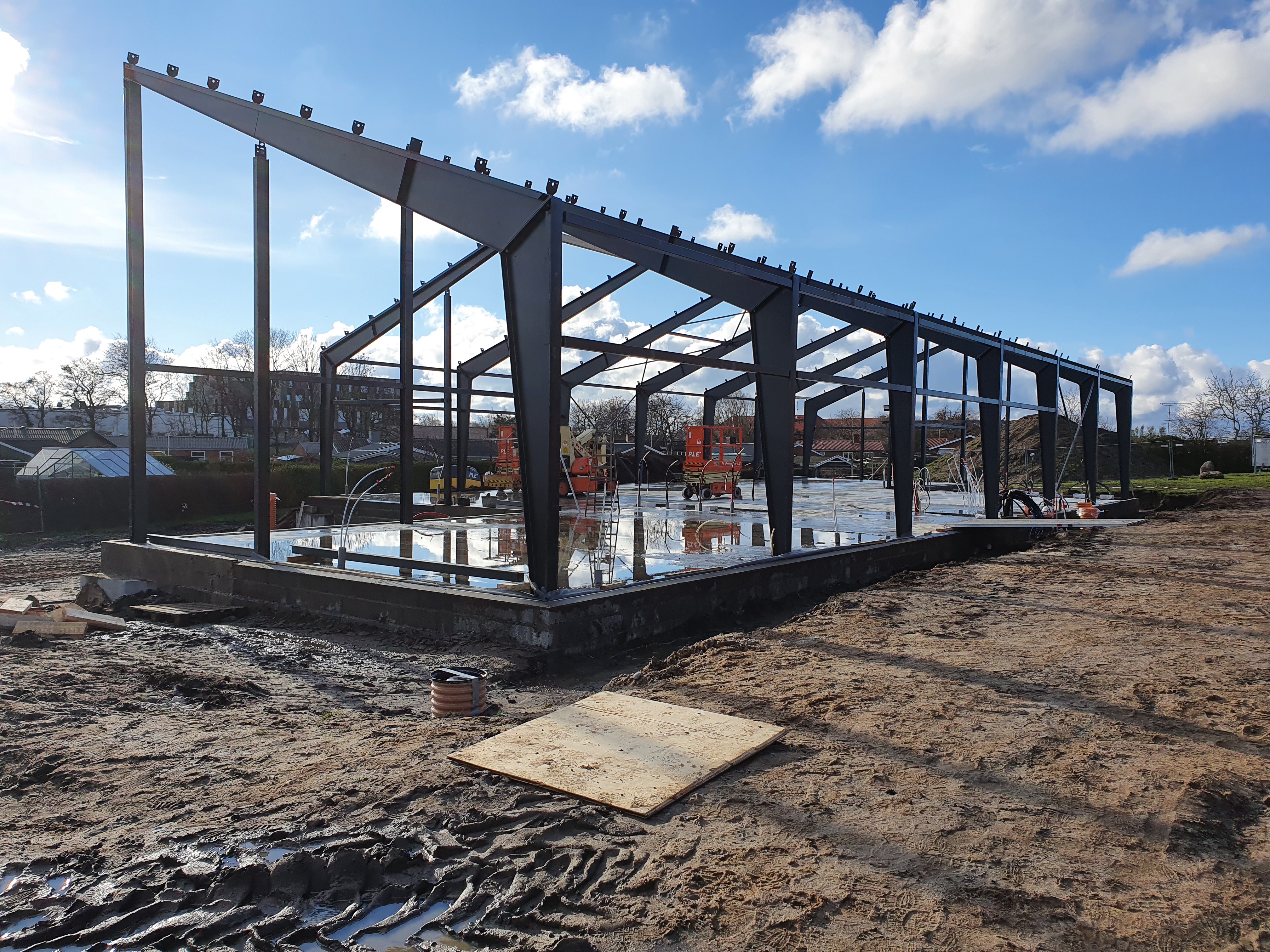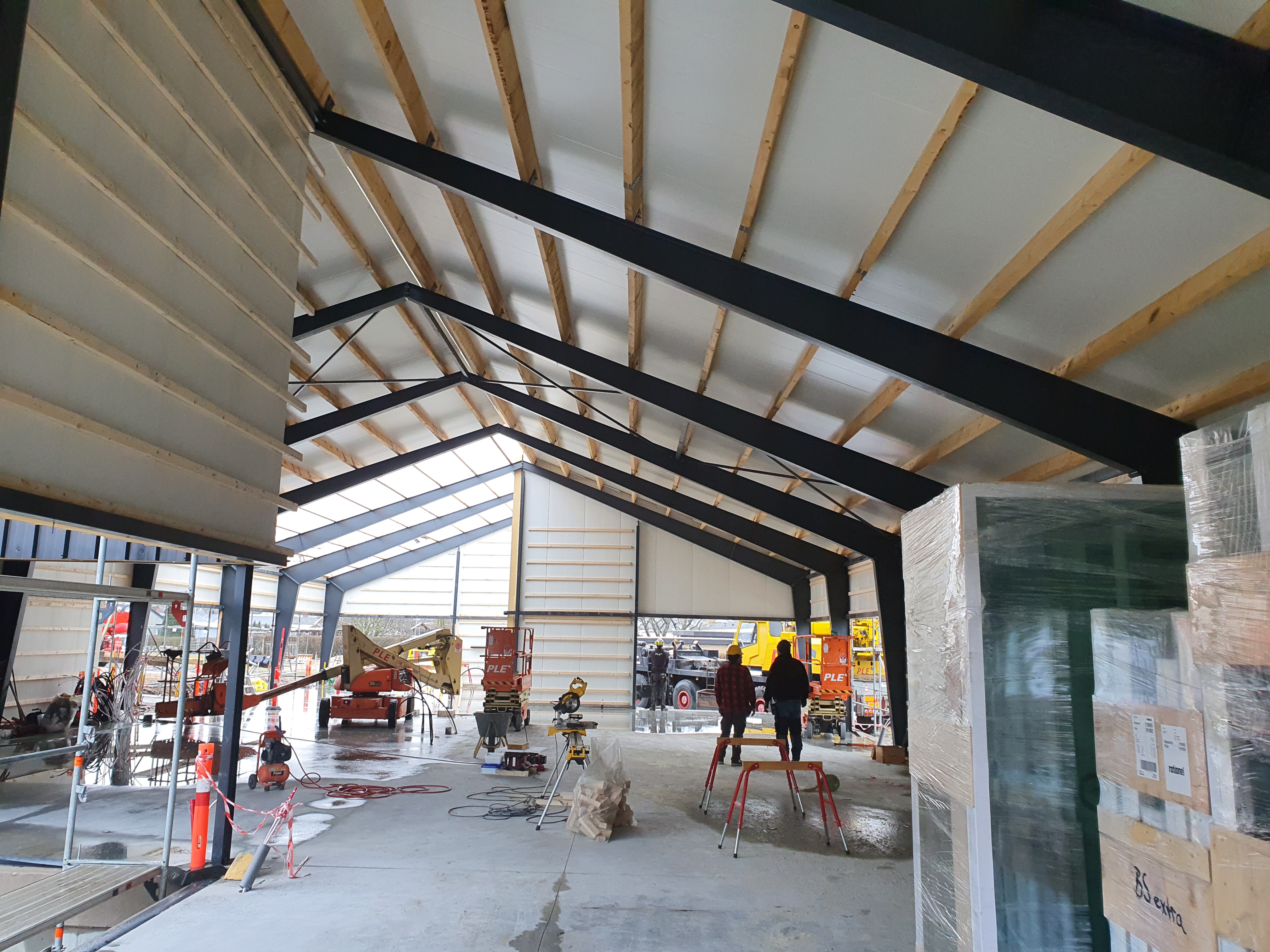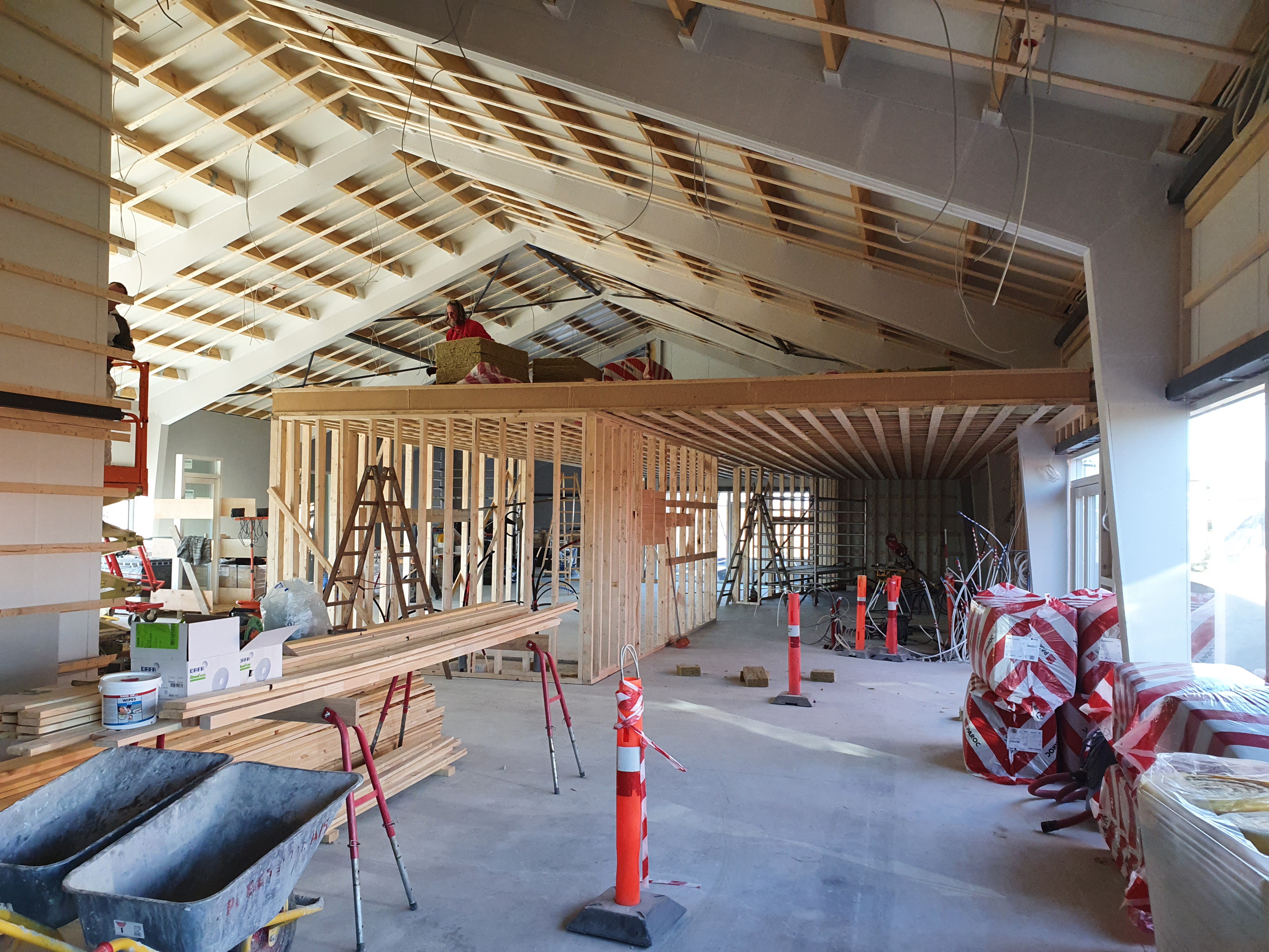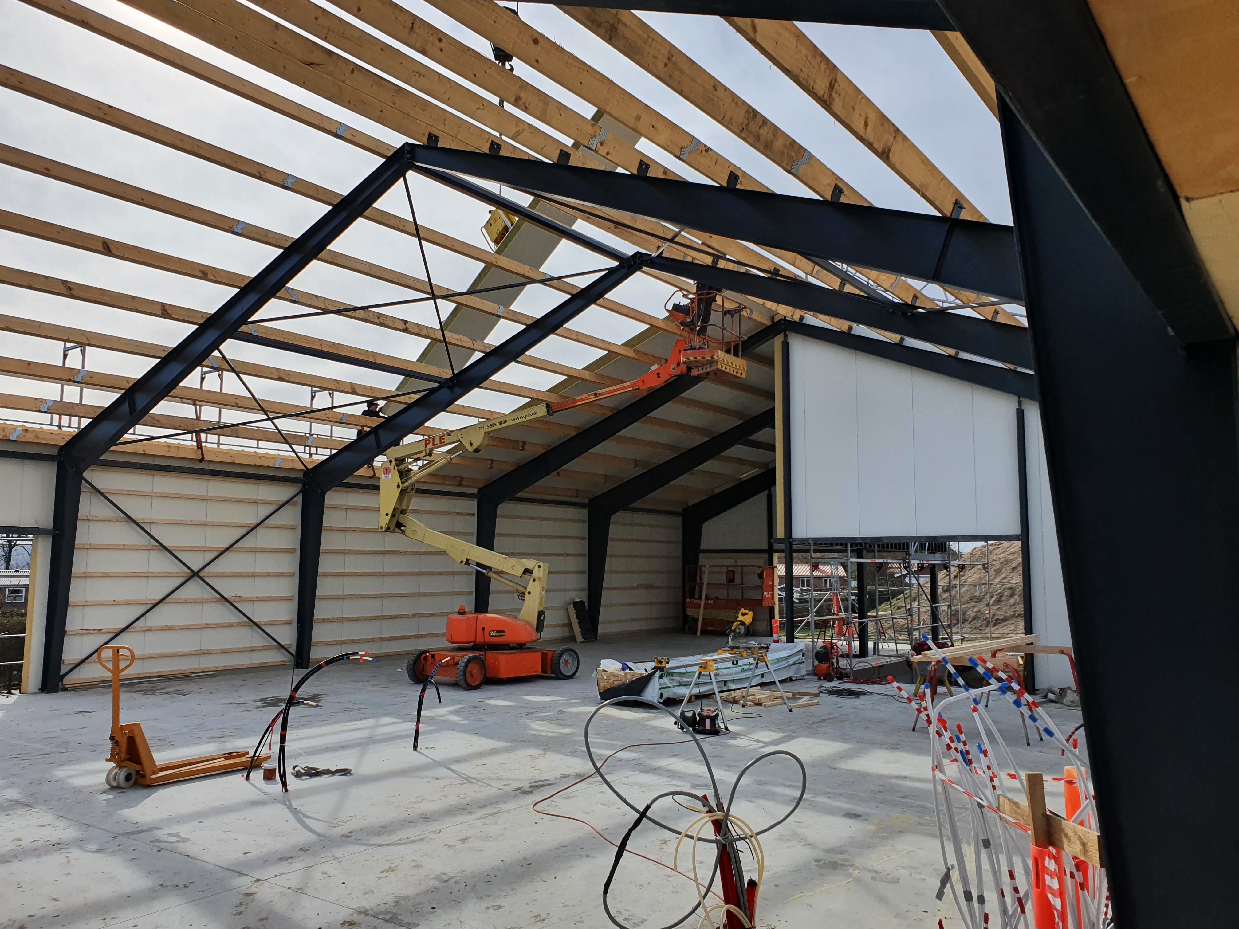 - 4. maj - "Dækket" er færdigt og der påbegyndes opførelse af ventilationsanlæg. Indervægge til omklædningsrum beklædes.