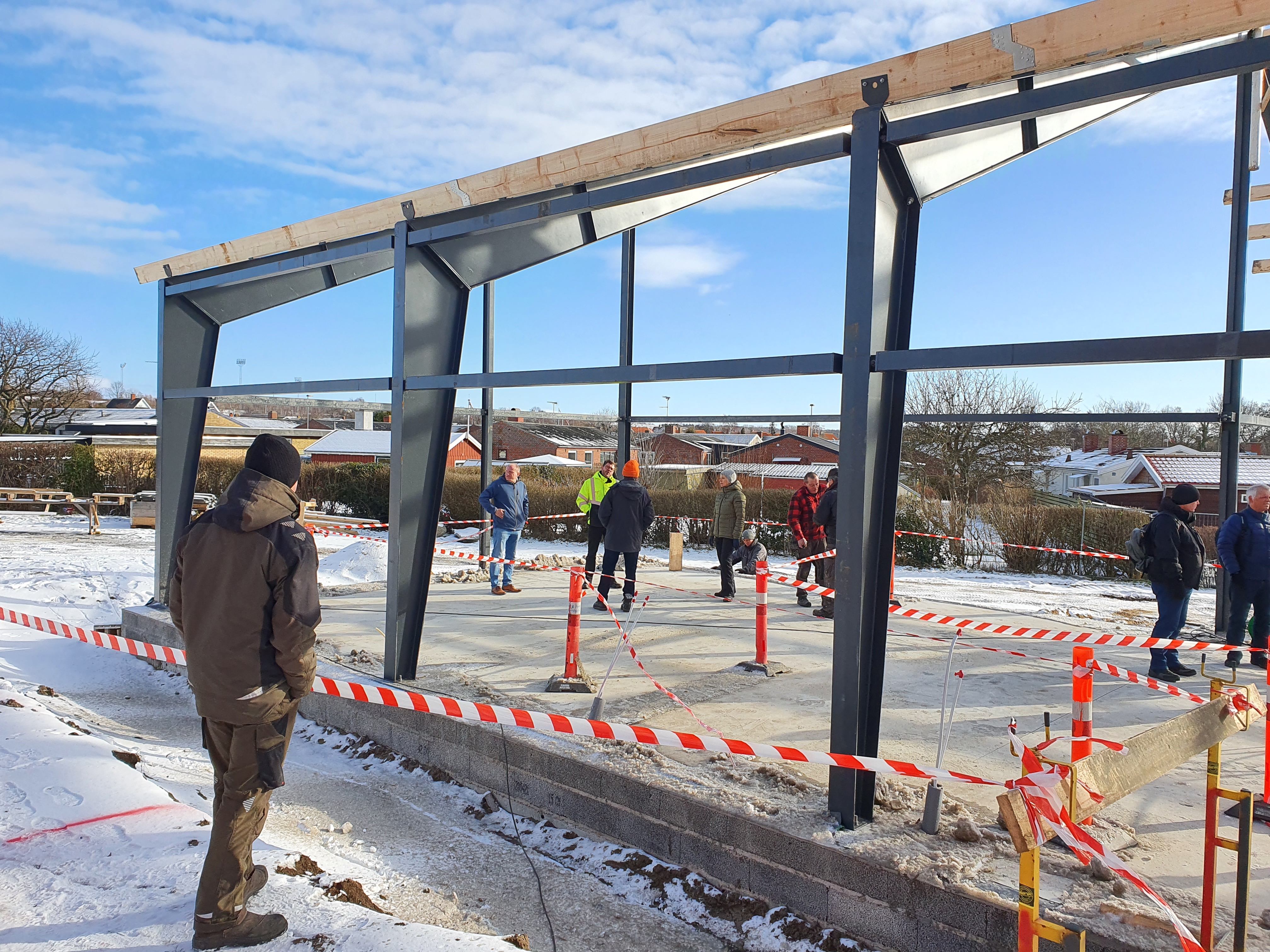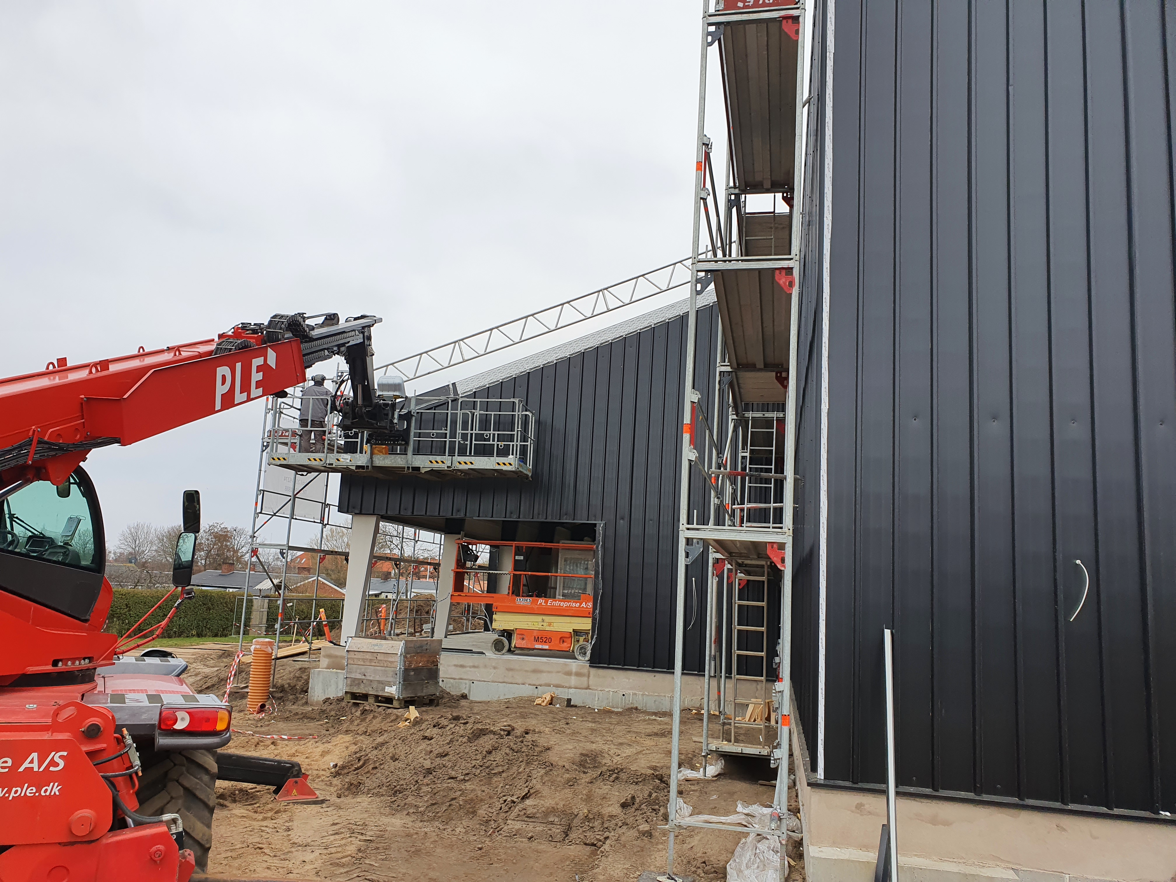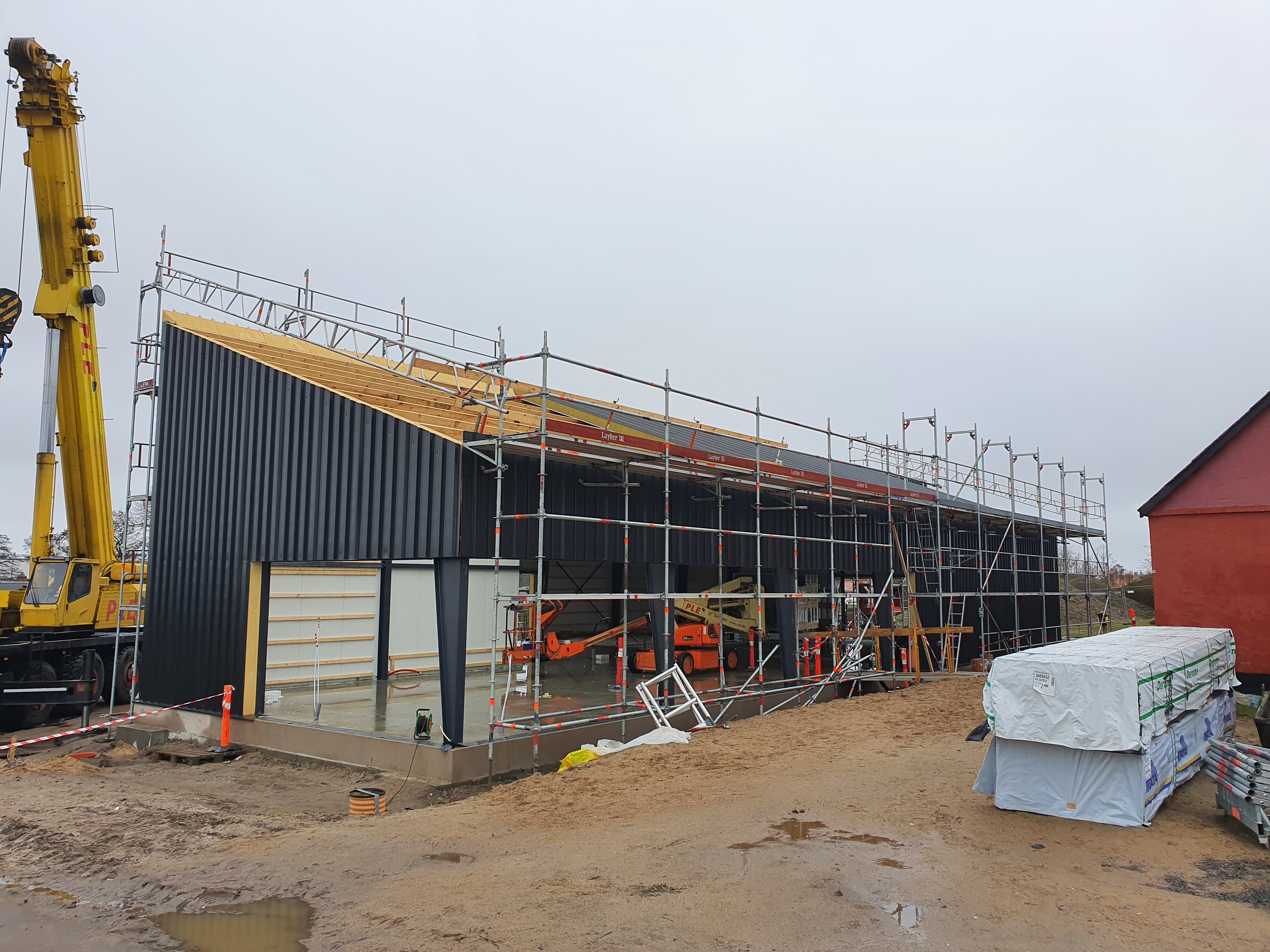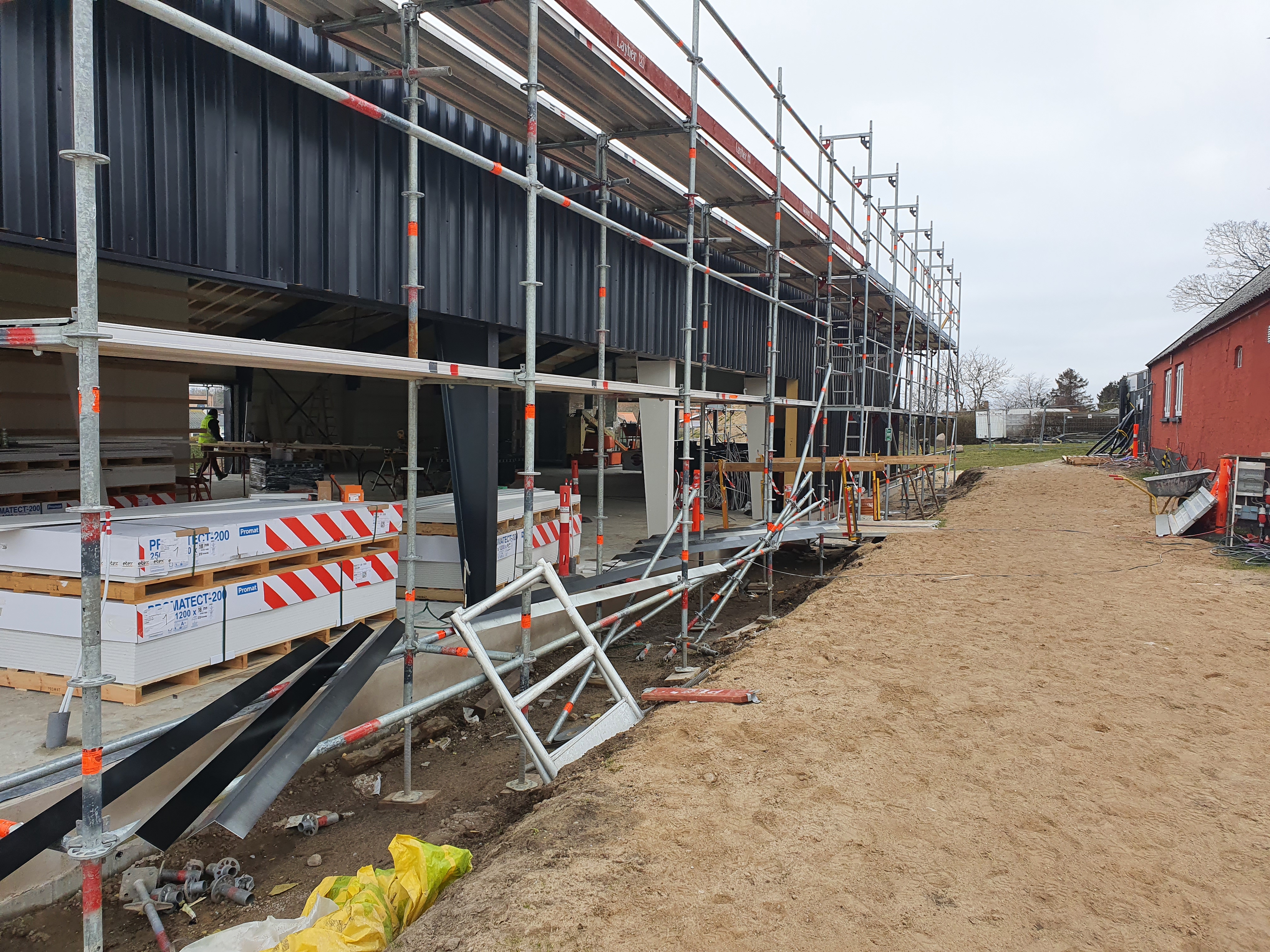- 8. marts - Ydervægge er monteret, der sættes stillads op, så taget kan blive lagt. Stillads er sikkerhed for folket på taget.