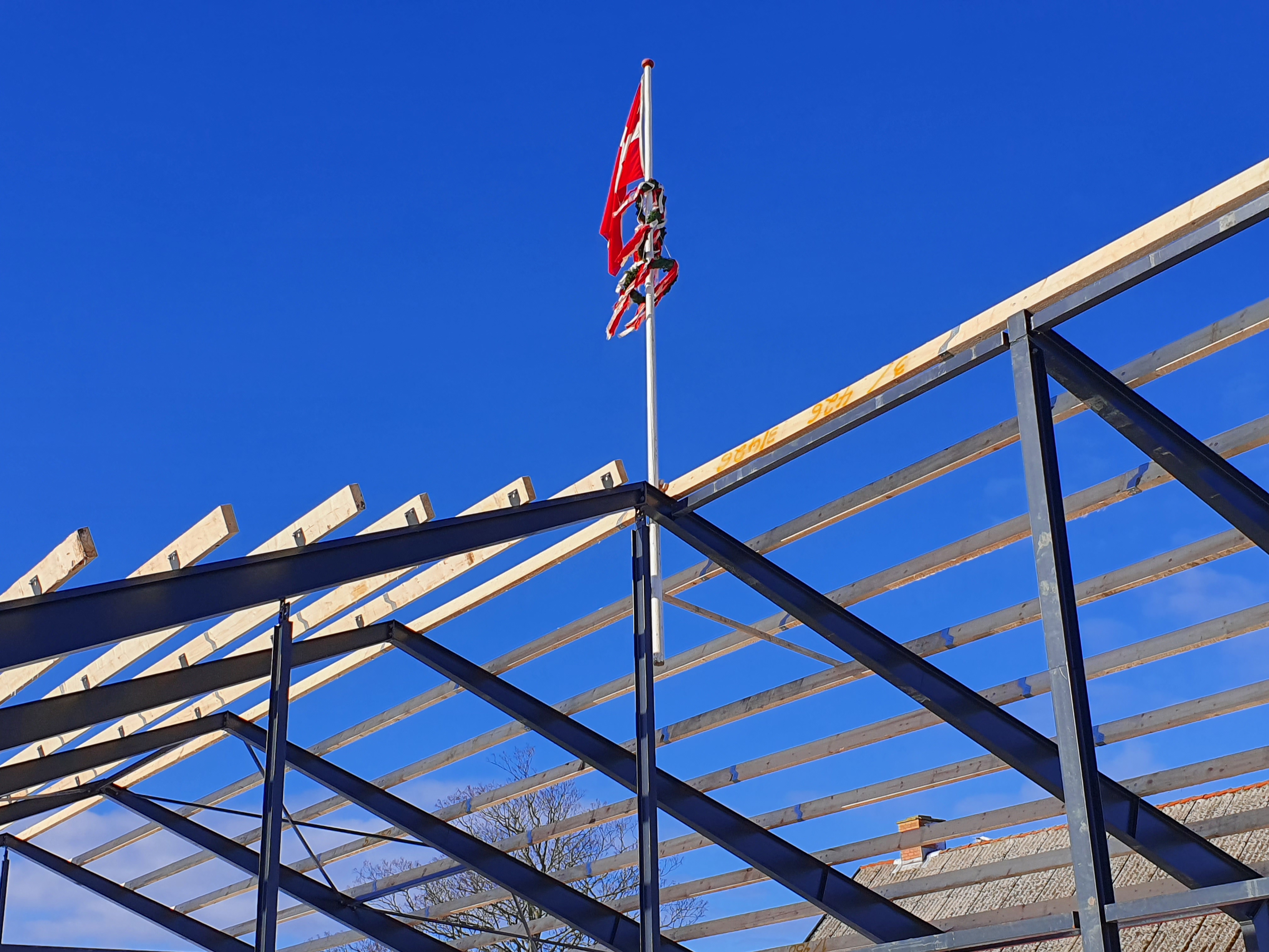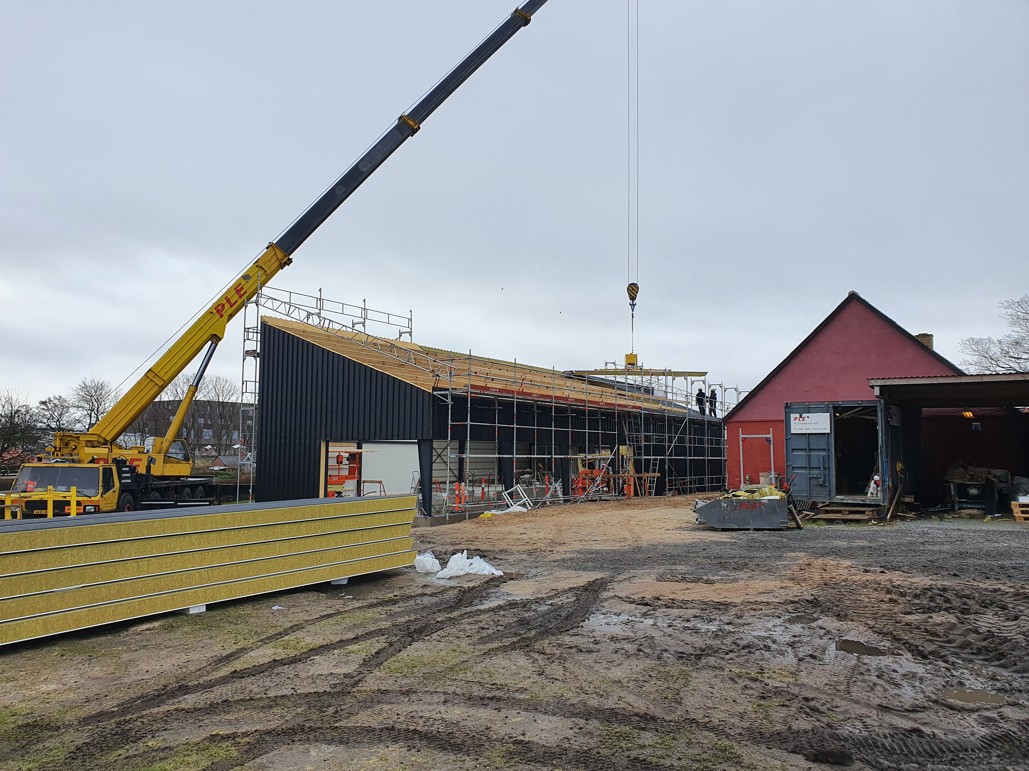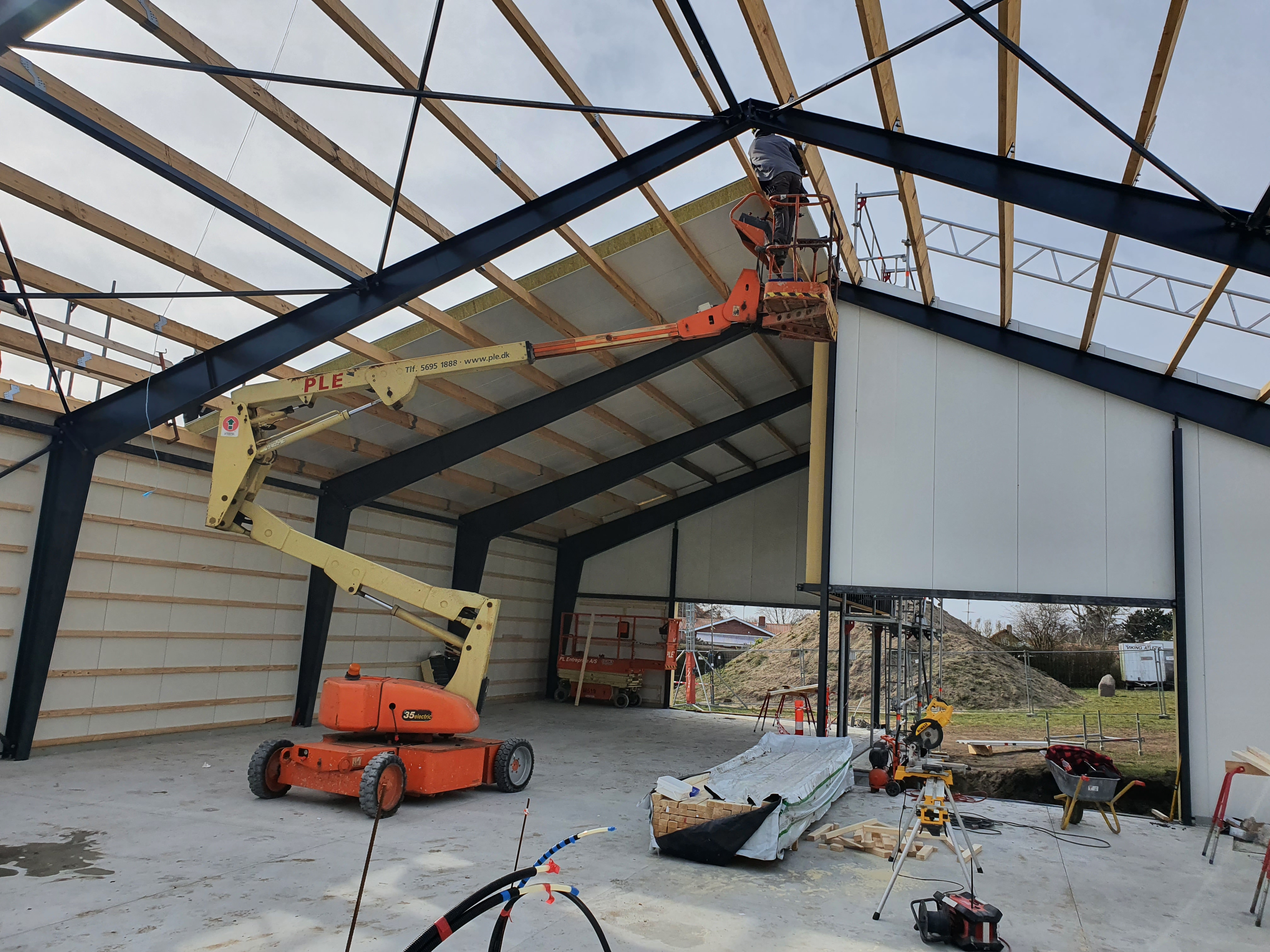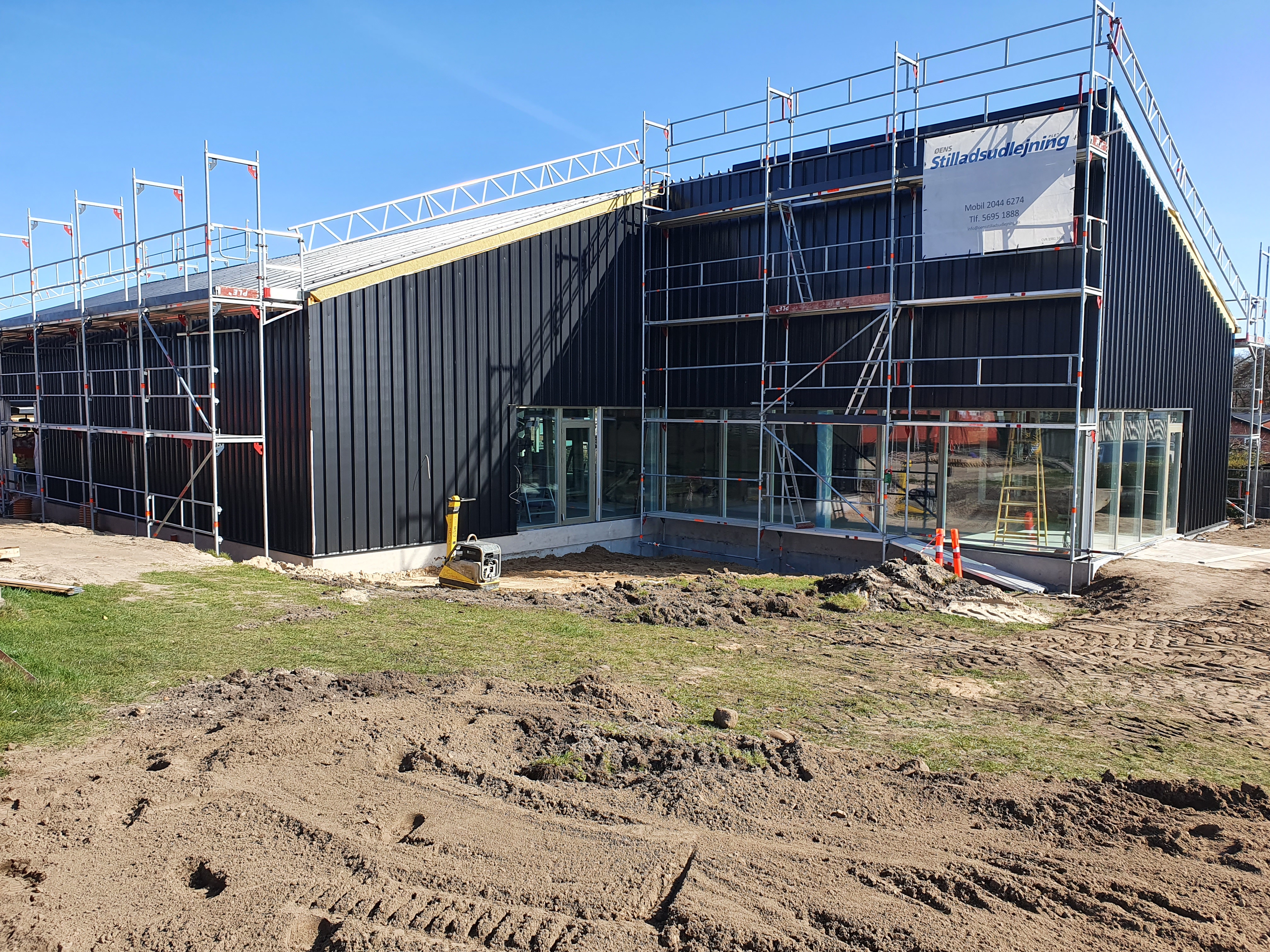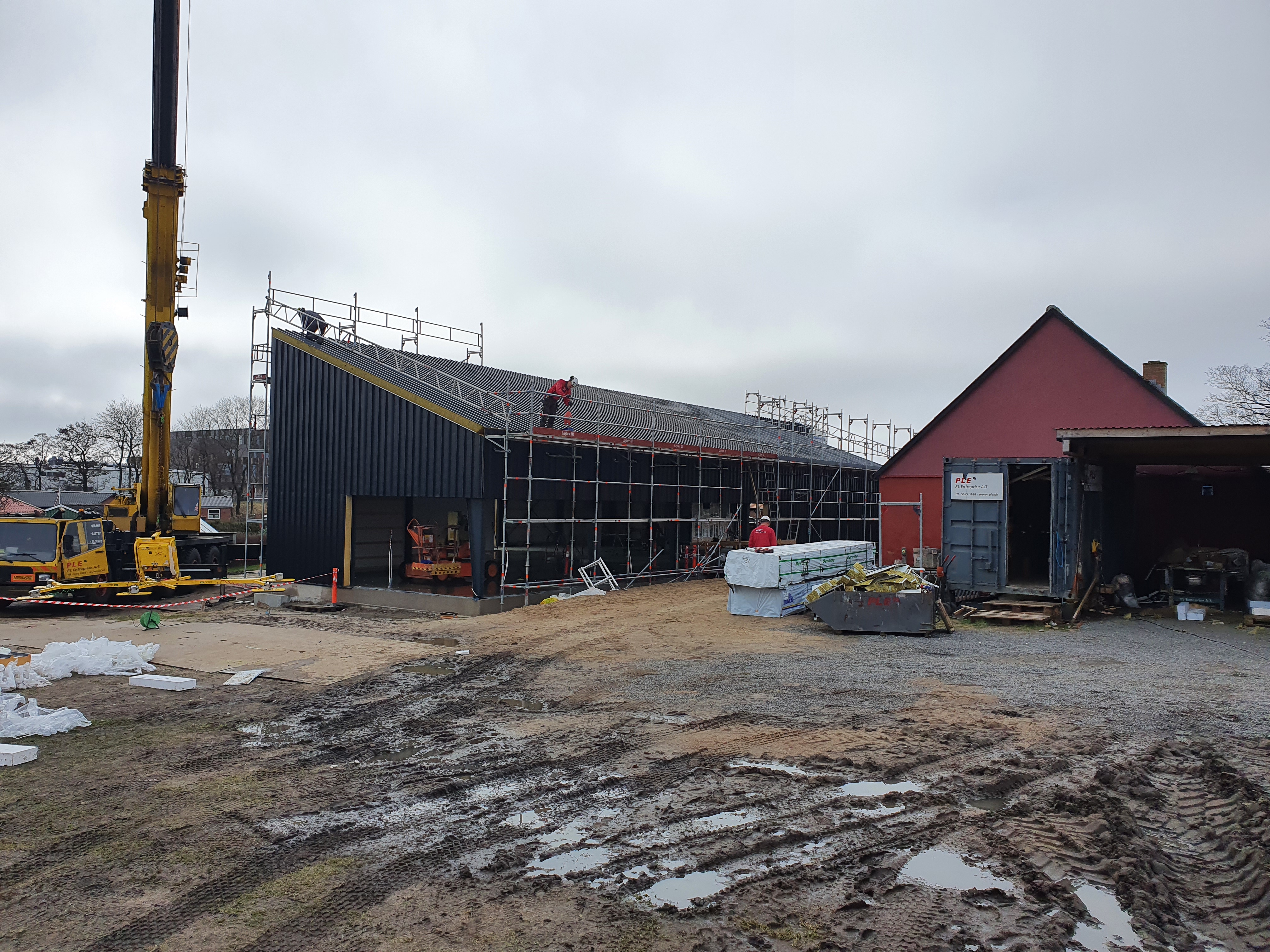 - 8. marts - Ydervægge er monteret, der sættes stillads op, så taget kan blive lagt. Stillads er sikkerhed for folket på taget.