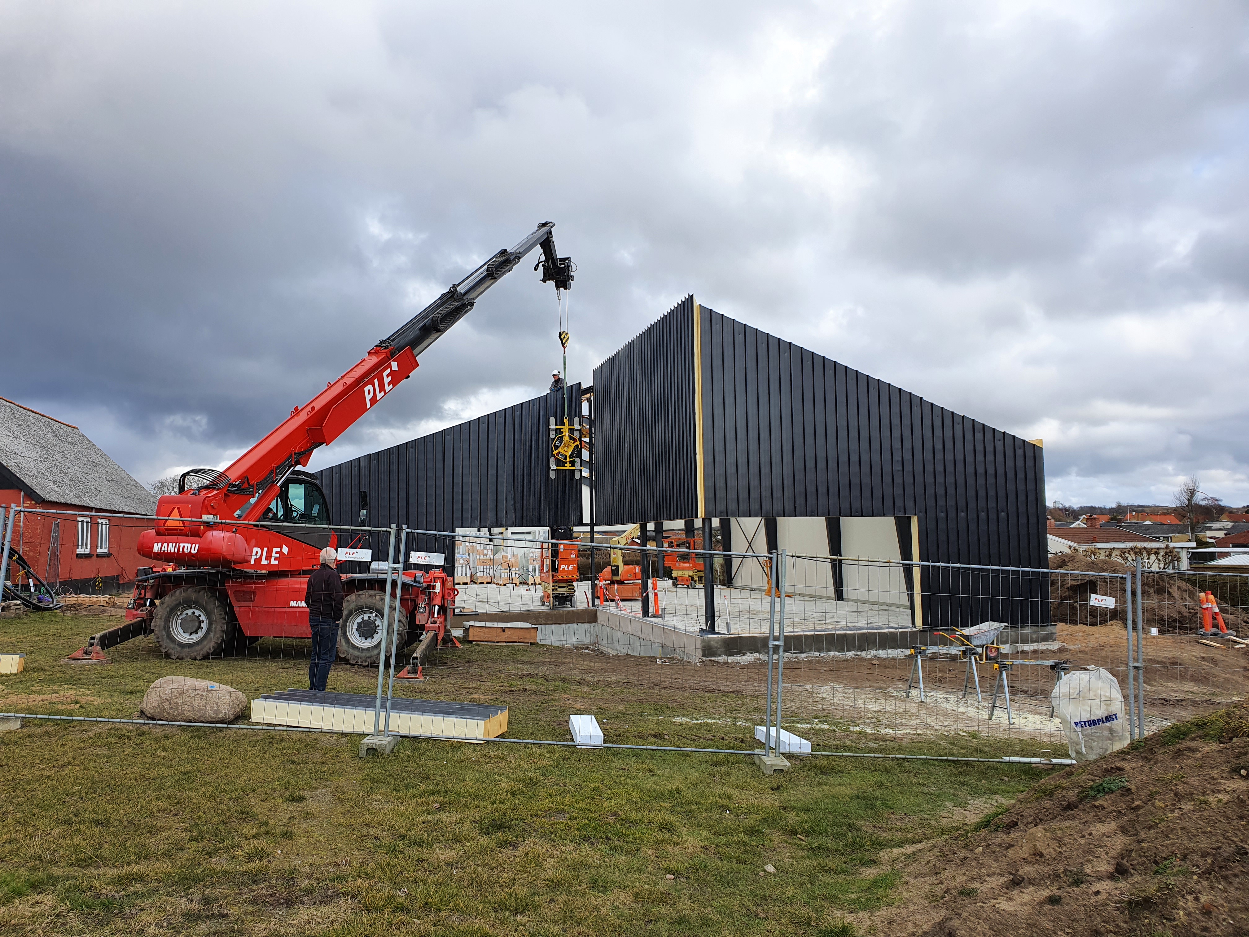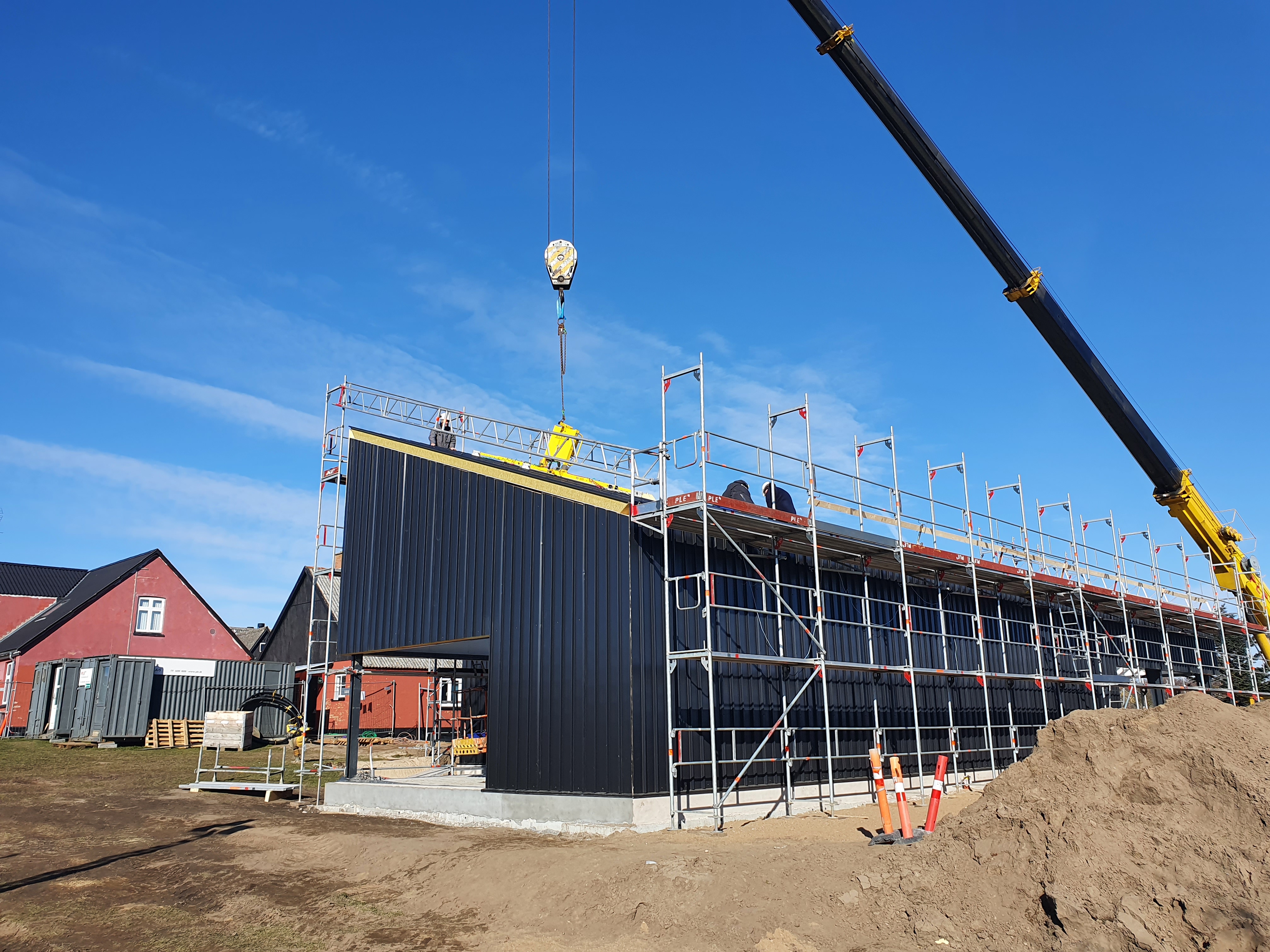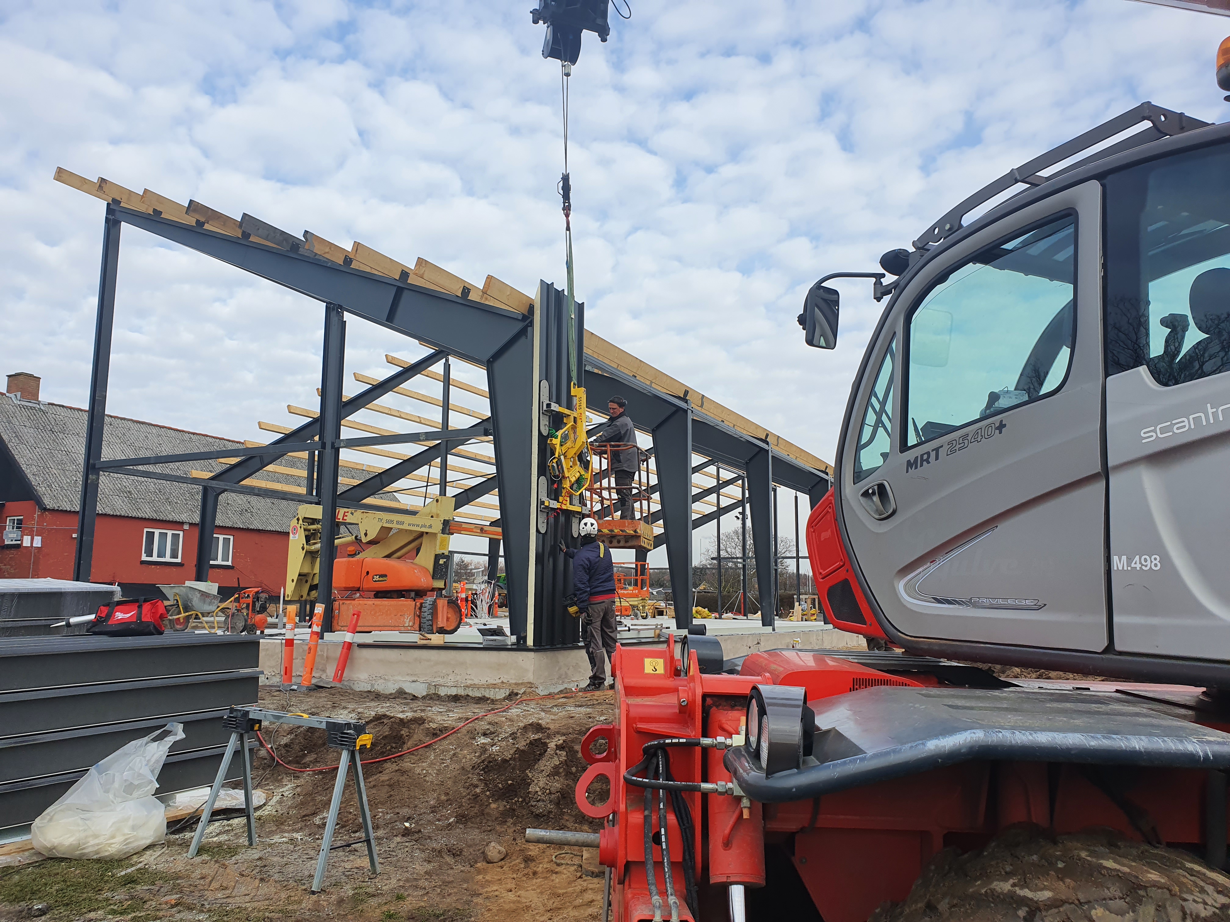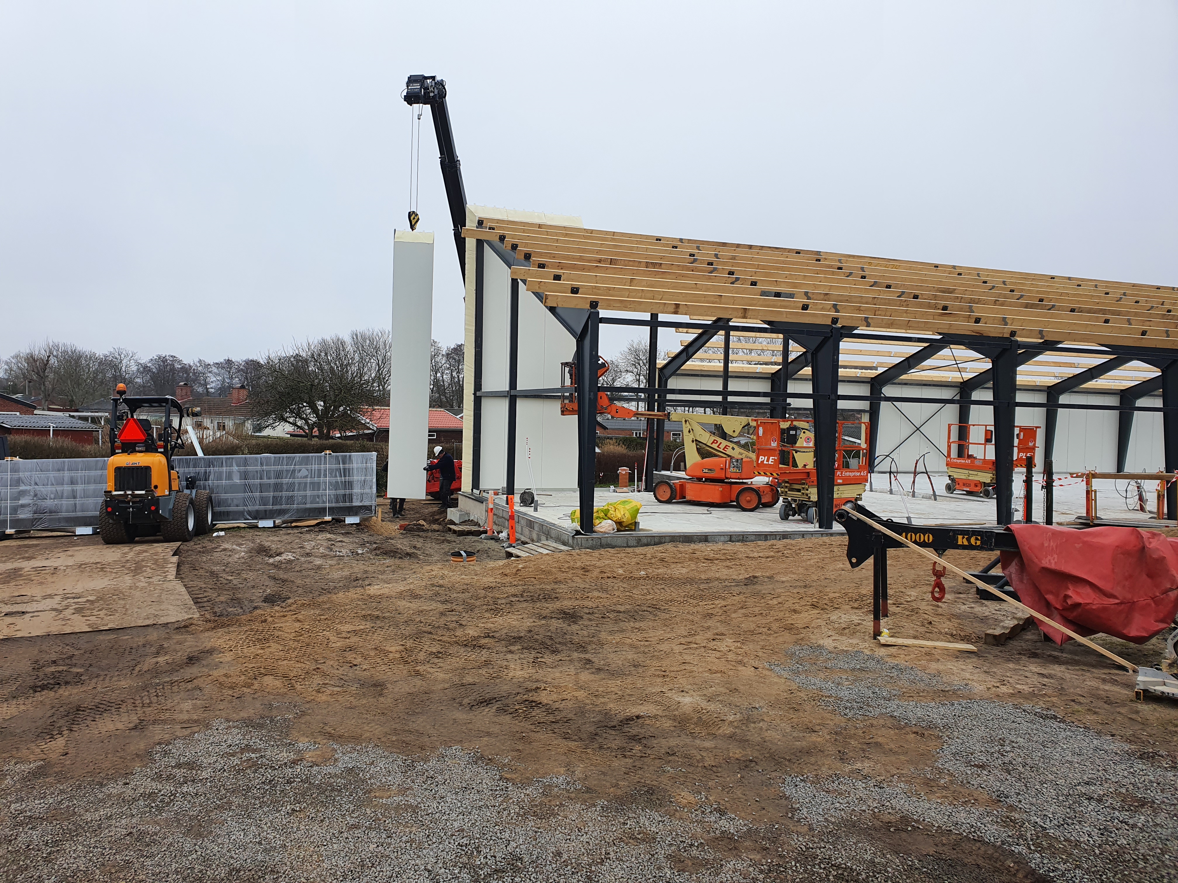 - 8. marts - Ydervægge er monteret, der sættes stillads op, så taget kan blive lagt. Stillads er sikkerhed for folket på taget.