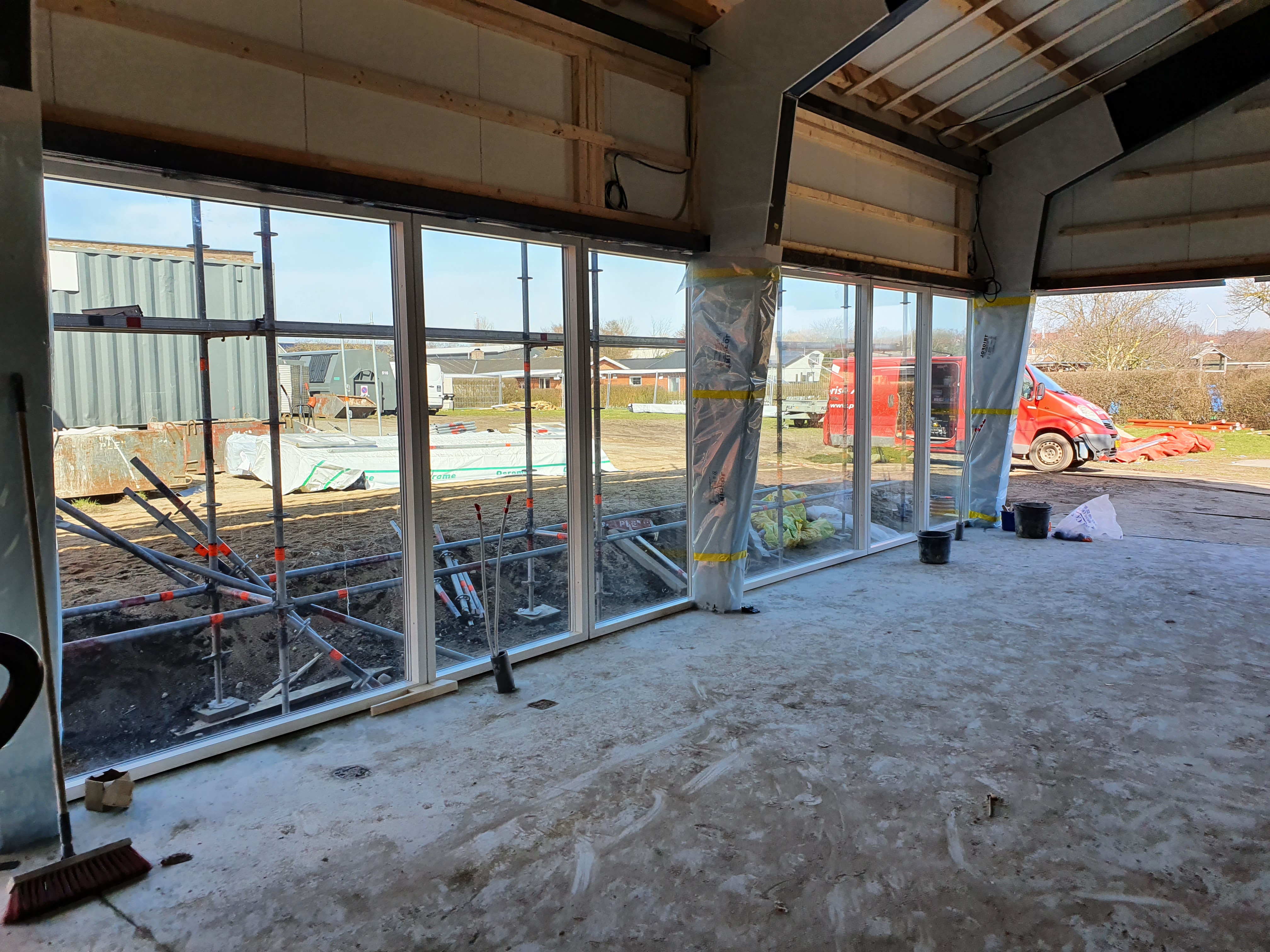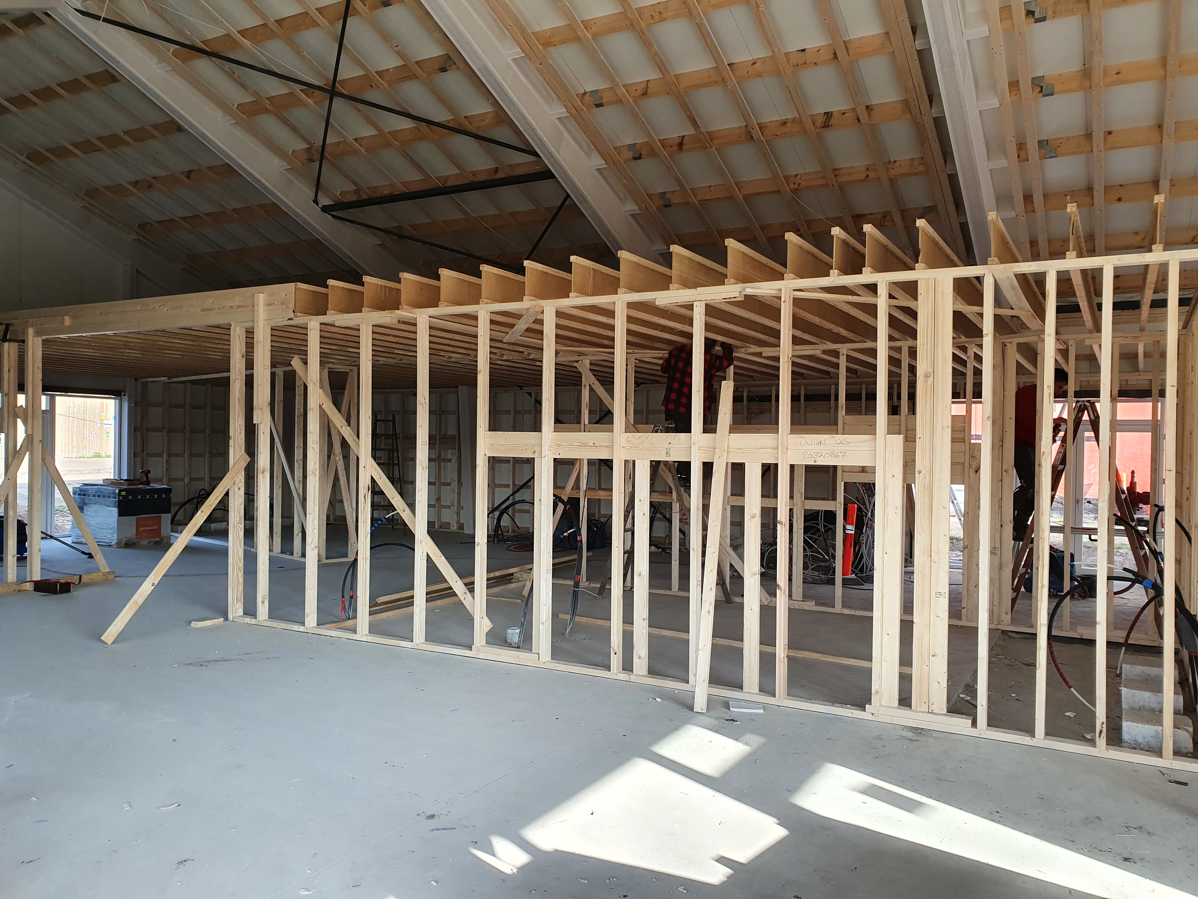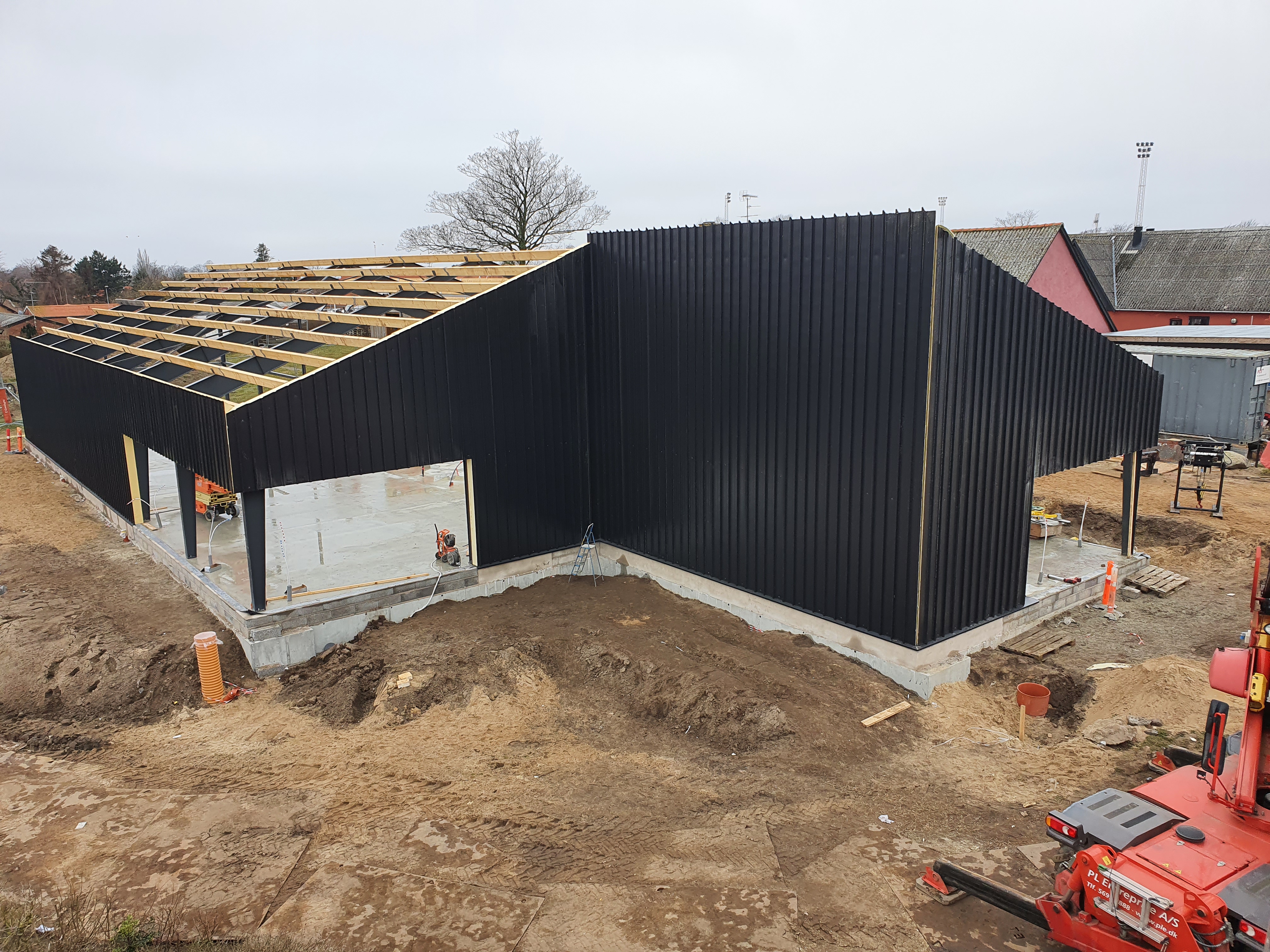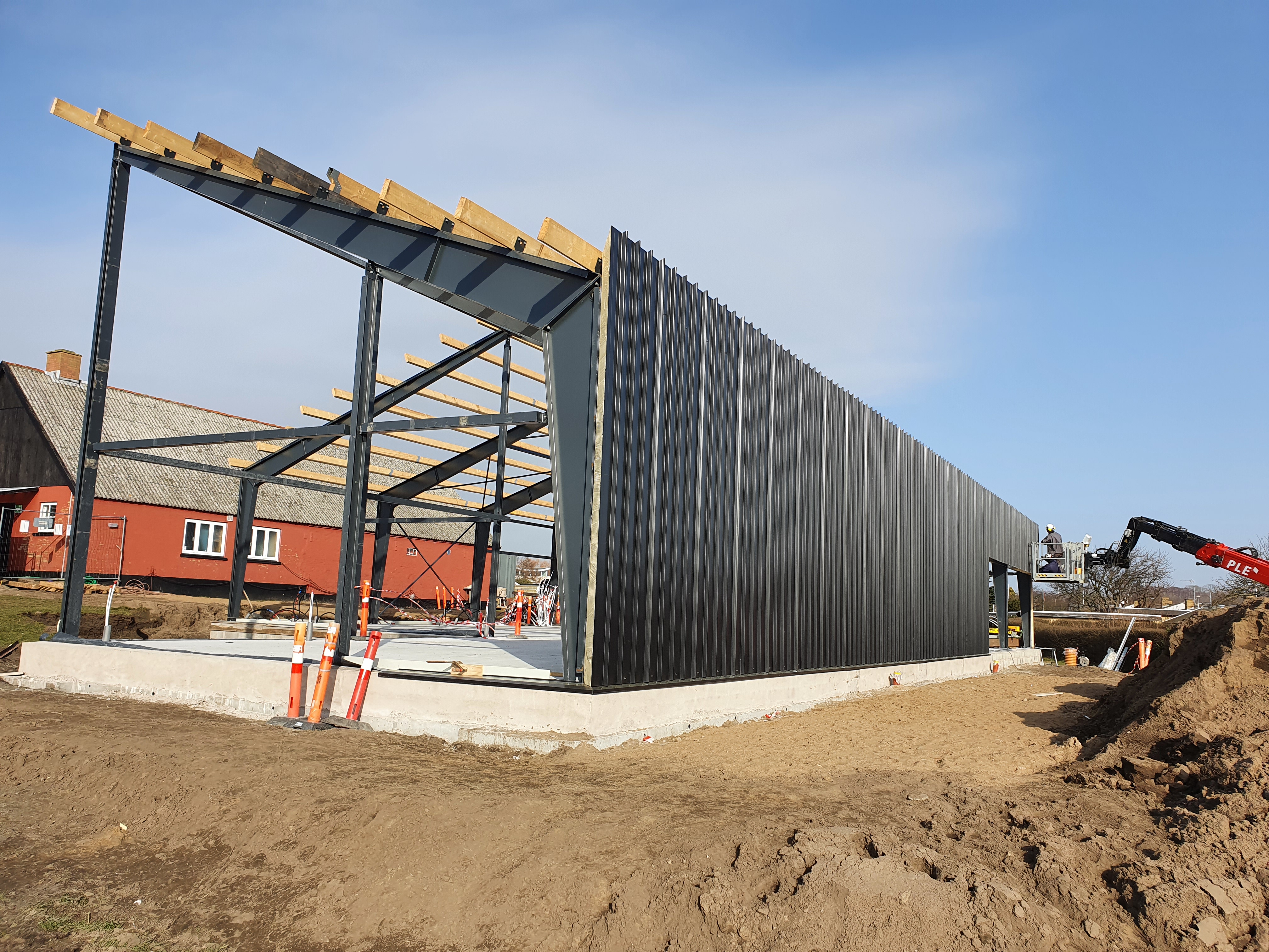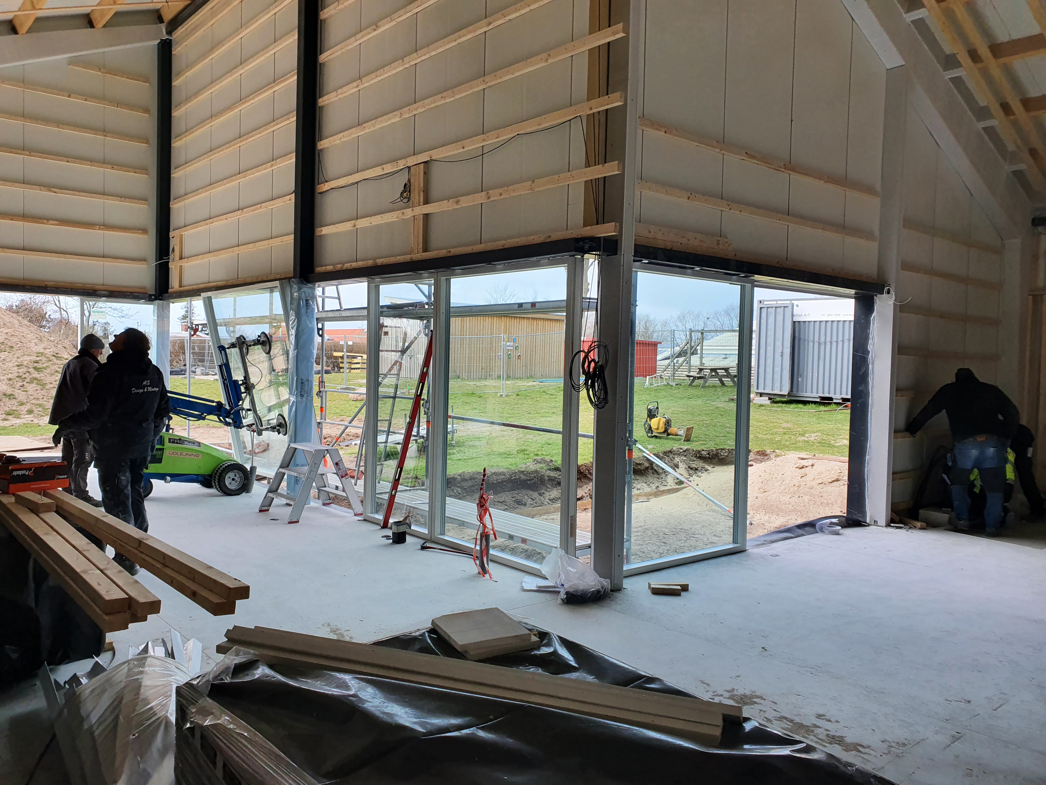 - 8. marts - Ydervægge er monteret, der sættes stillads op, så taget kan blive lagt. Stillads er sikkerhed for folket på taget.