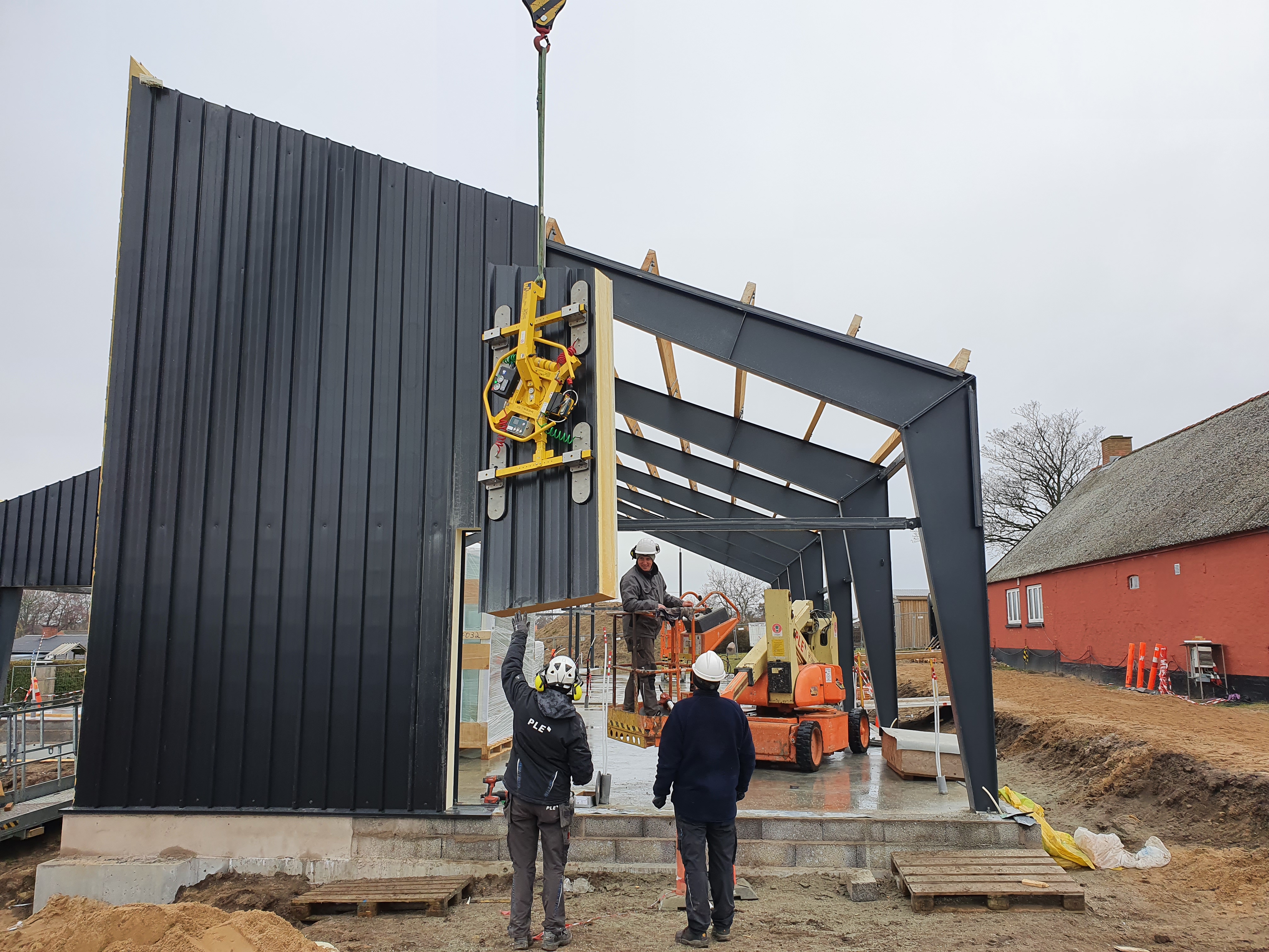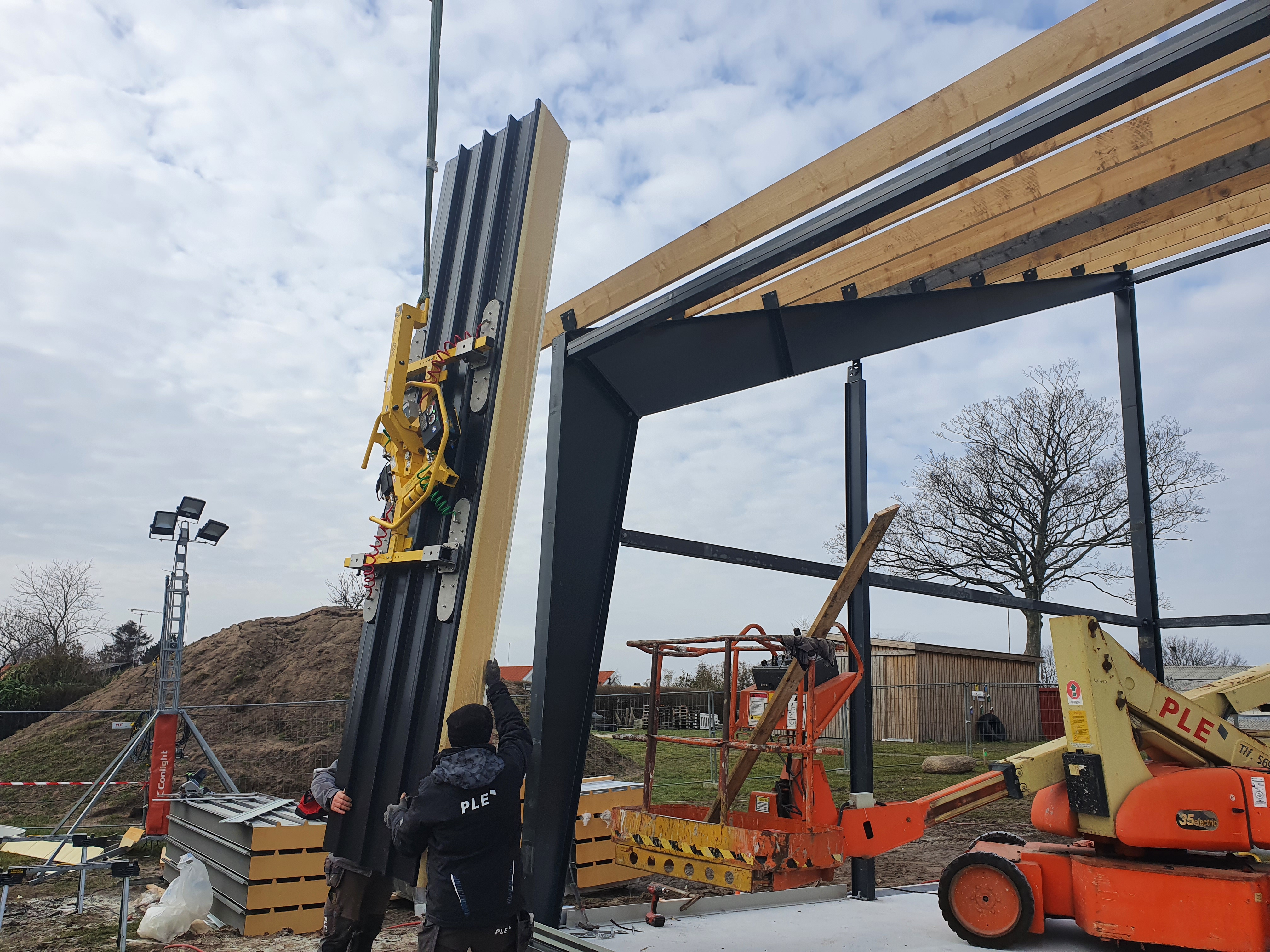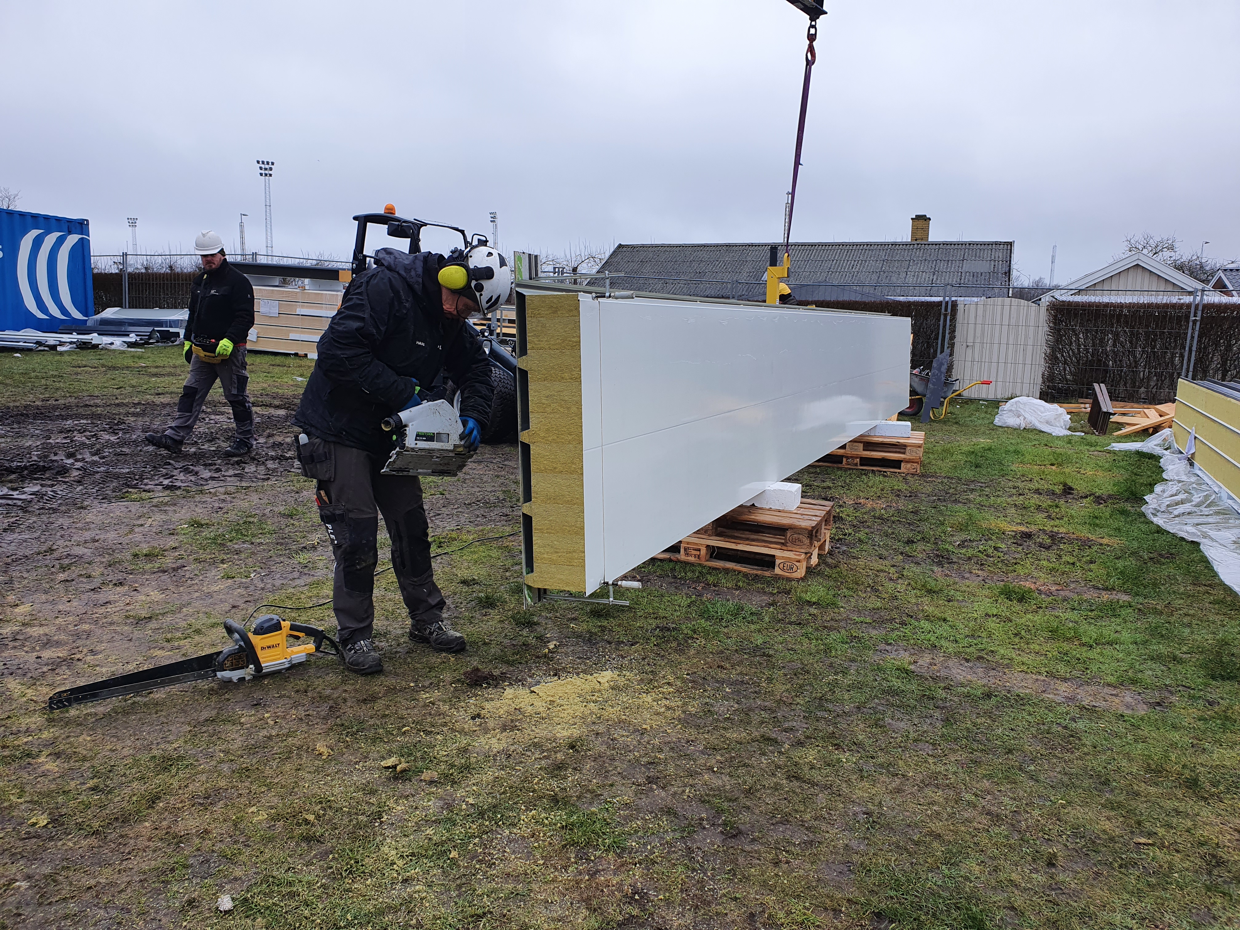 - 23. februar - Ydervægge monteres. Yderbeklædning og isolering i et stykke. 4 m2 pr. kassette