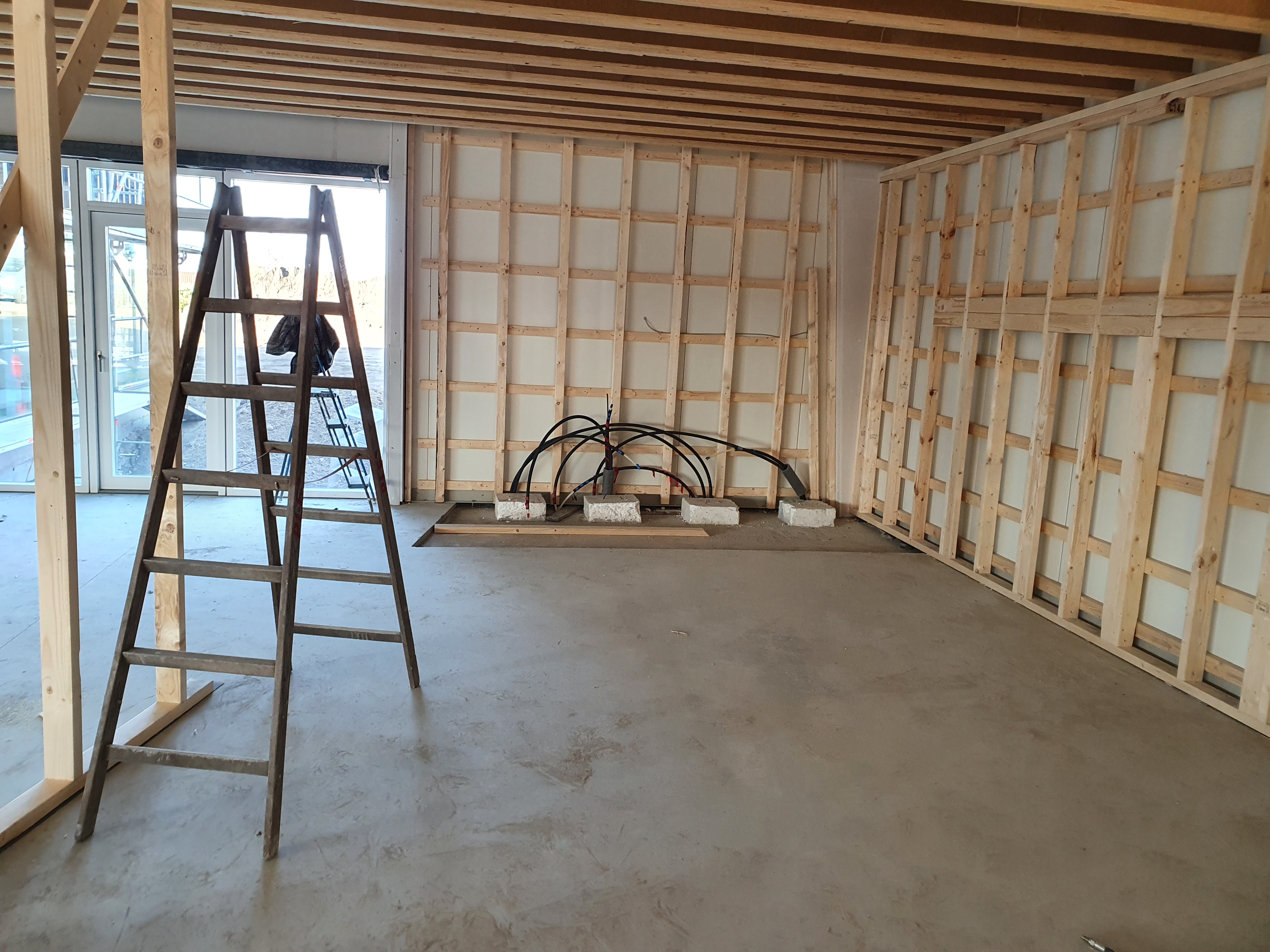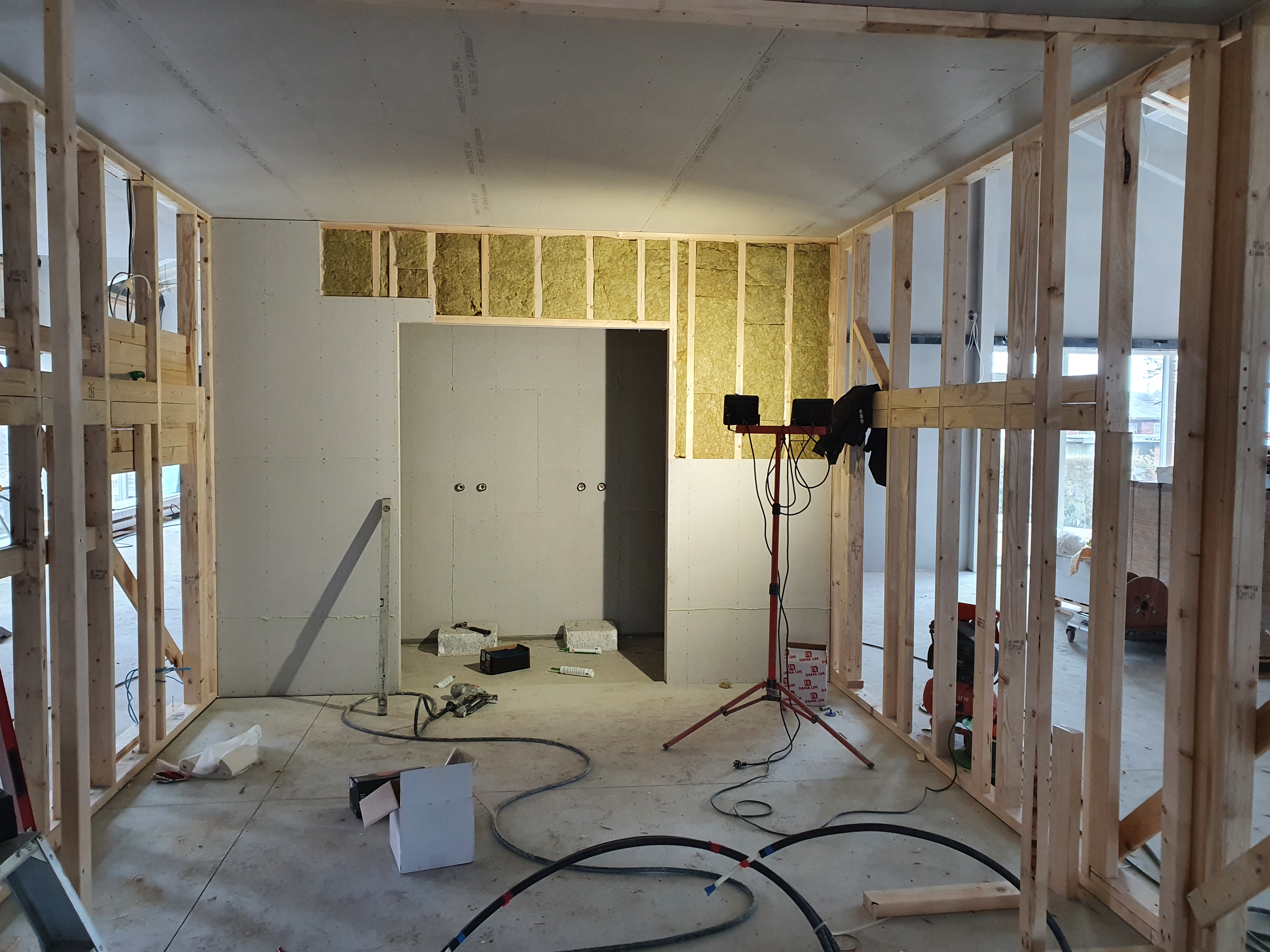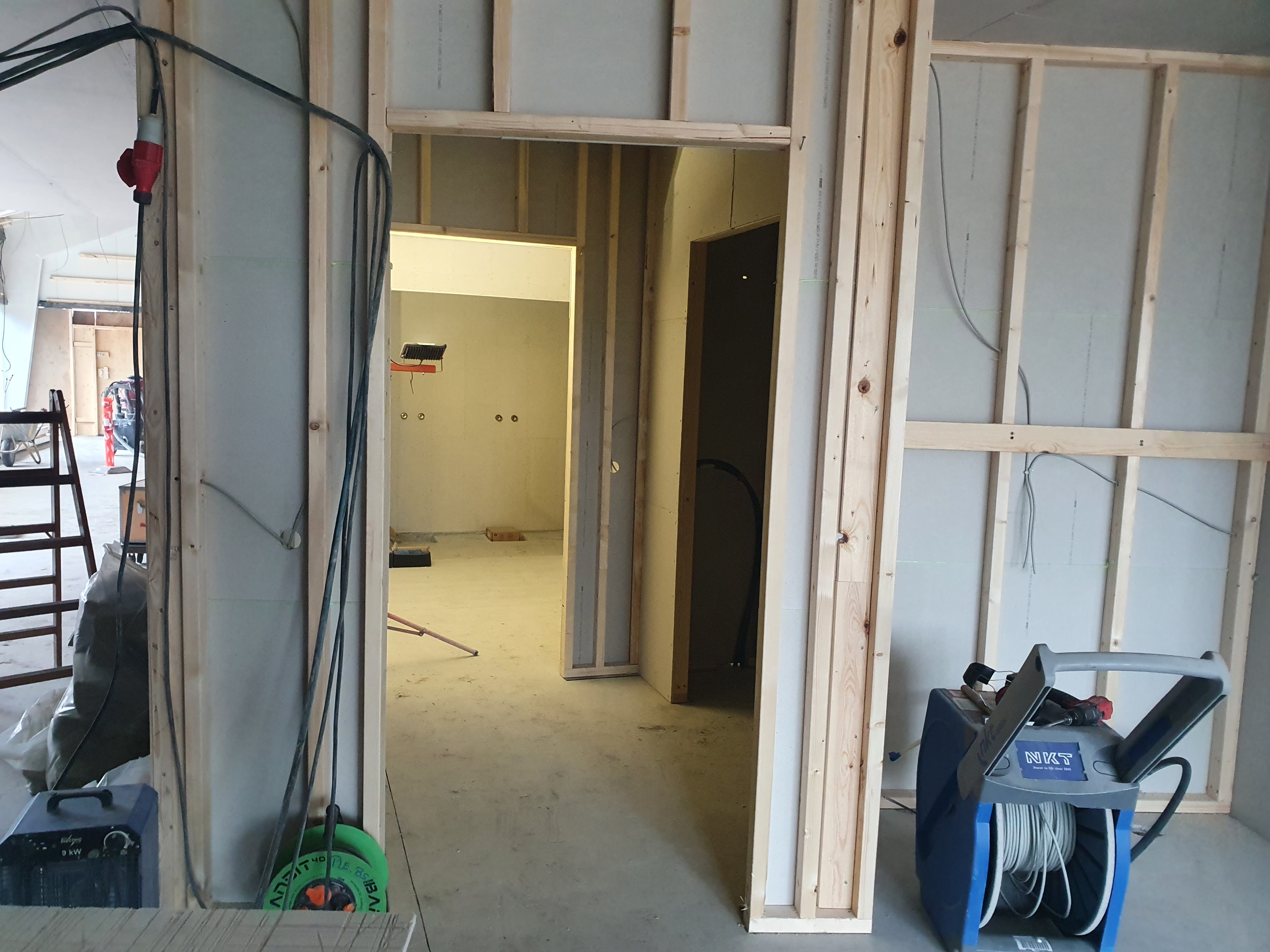 - 22. marts - Ledninger trækkes til el, lyd, alarm mv.