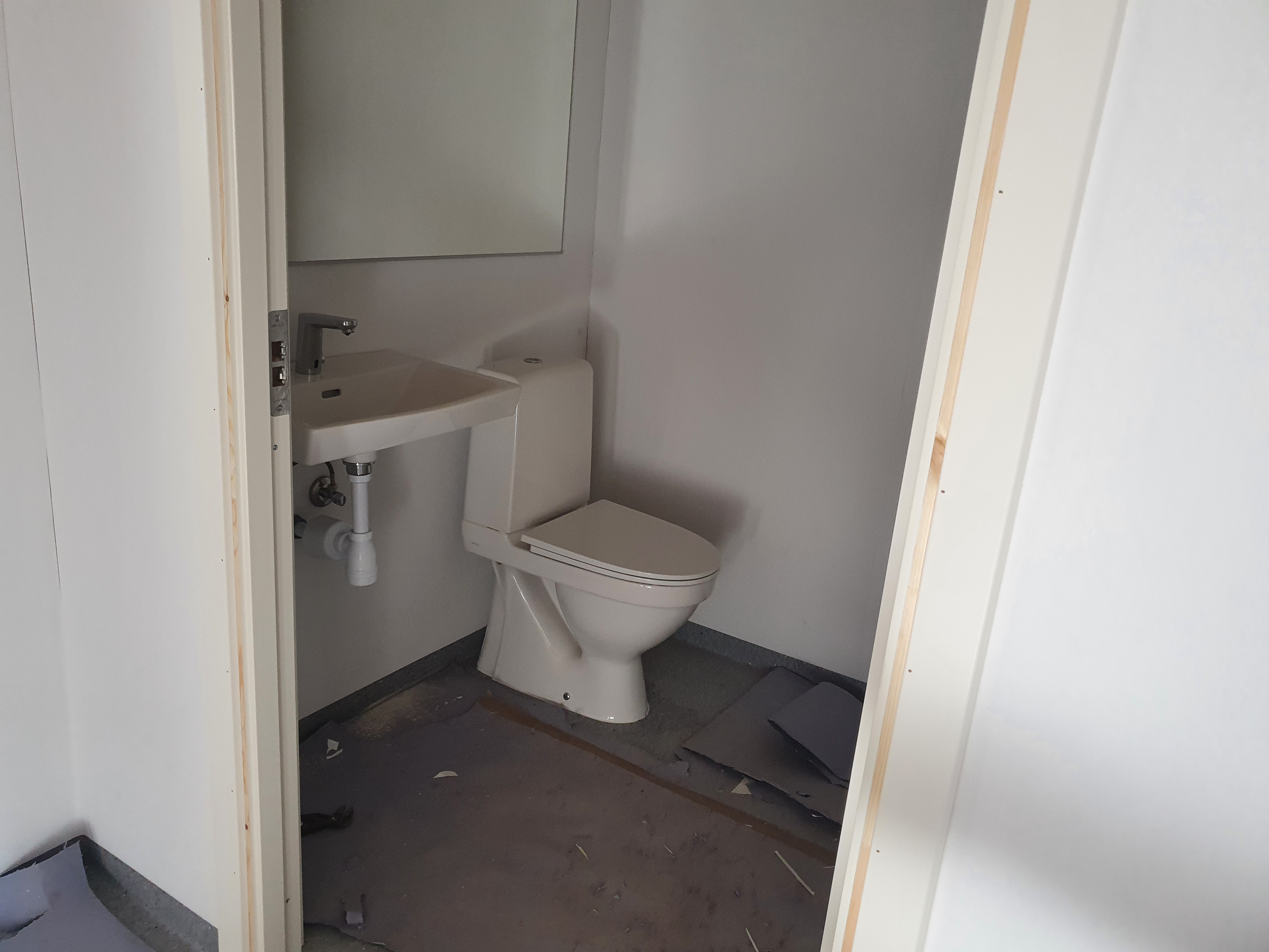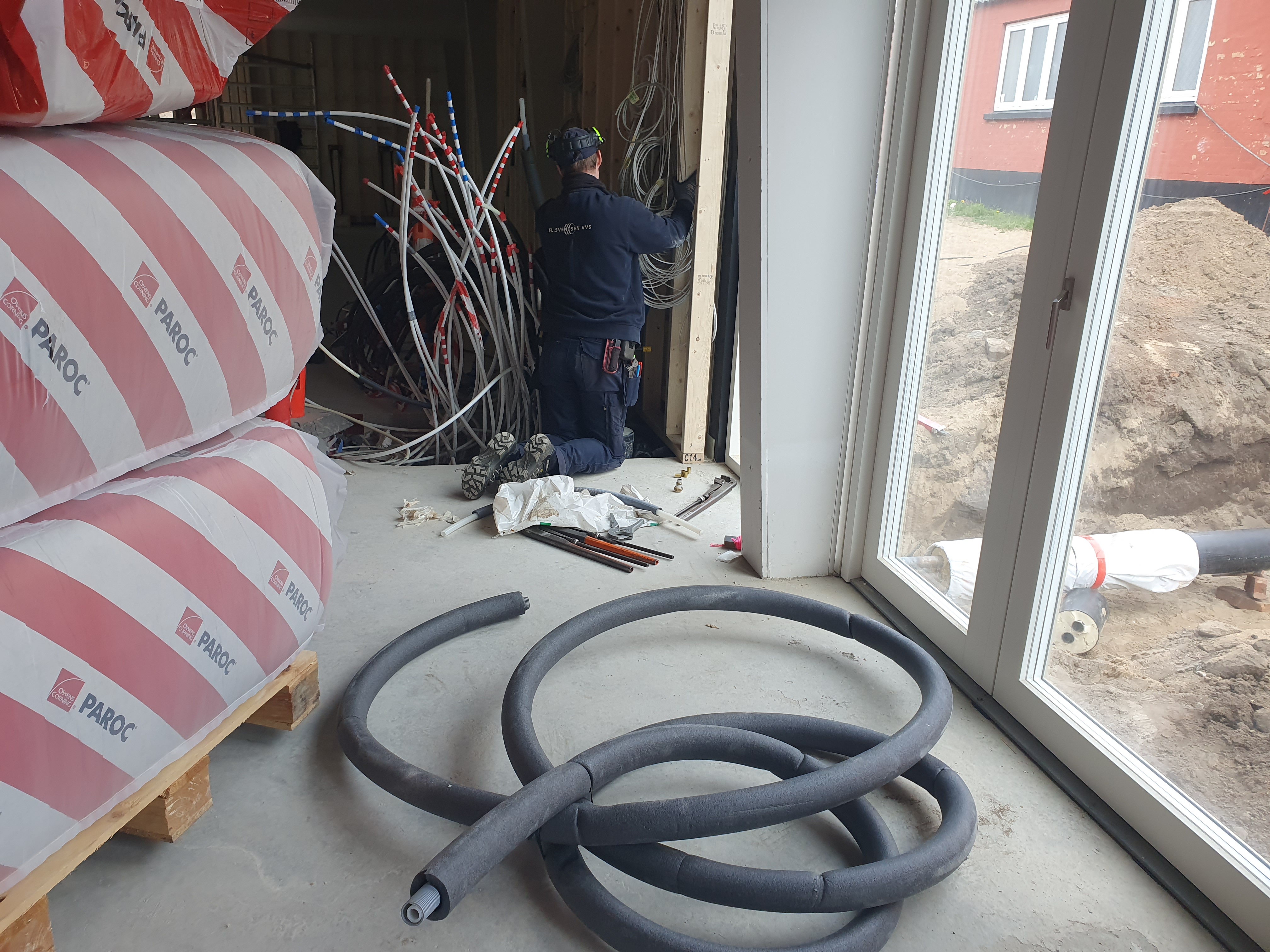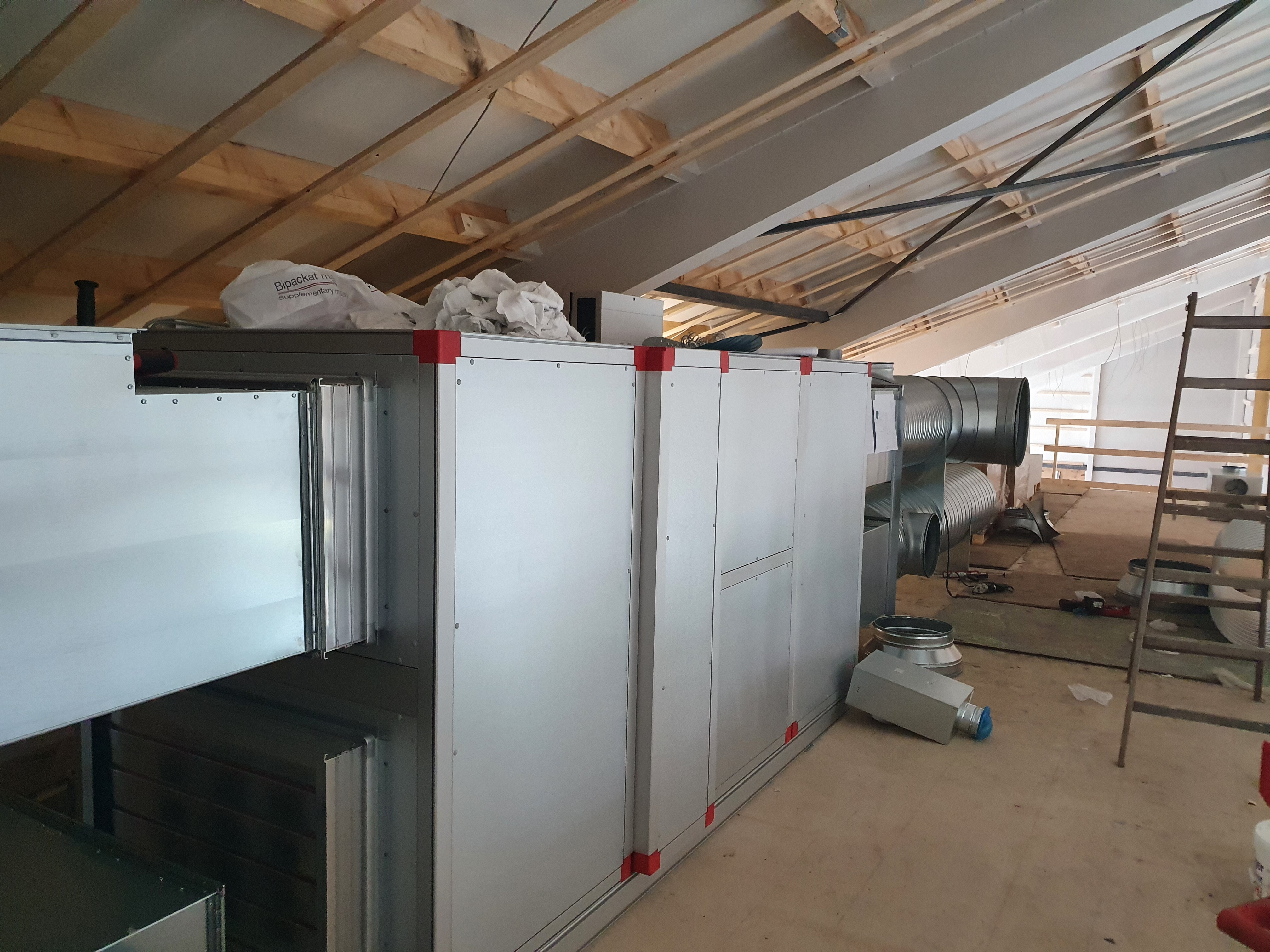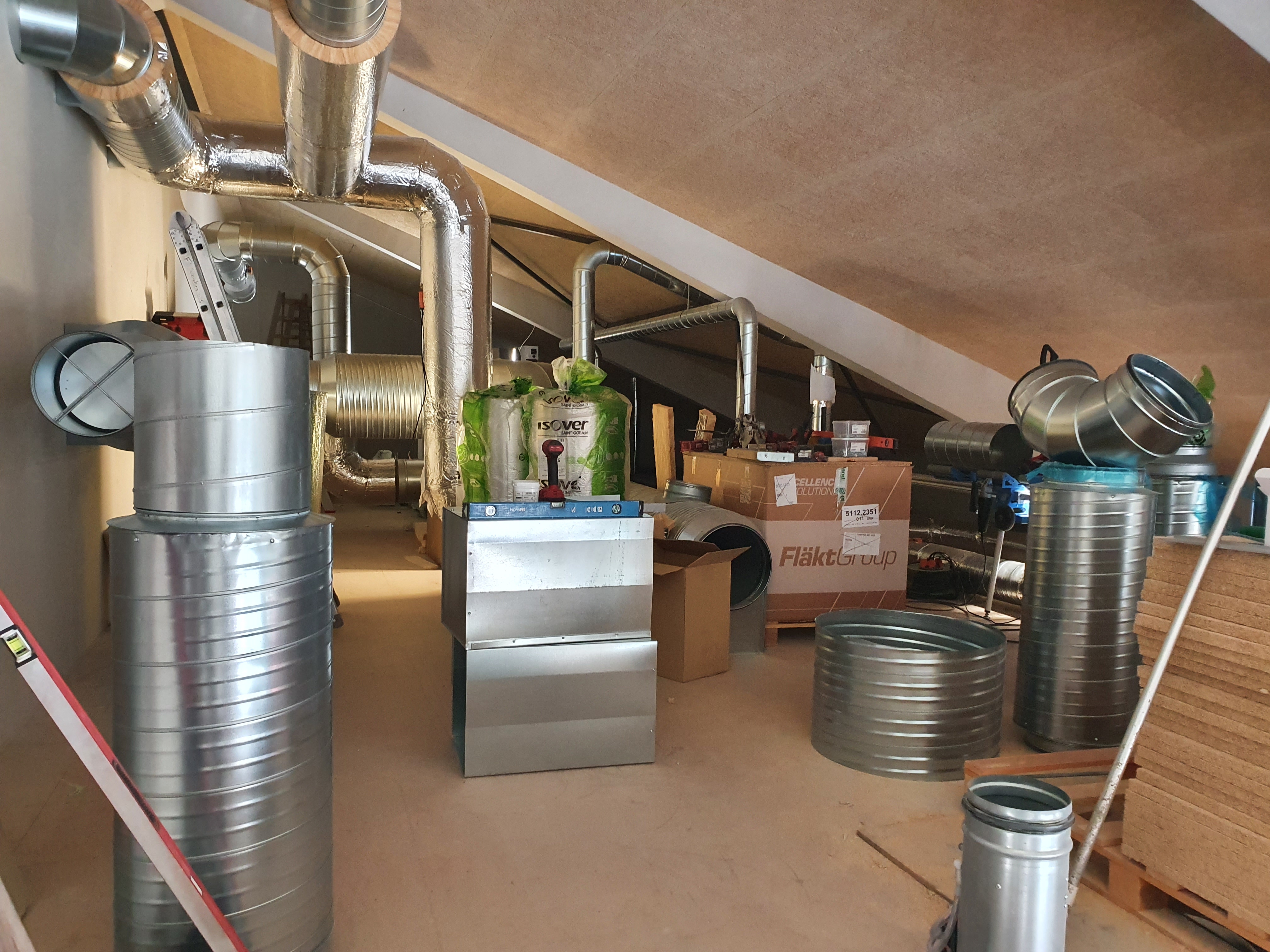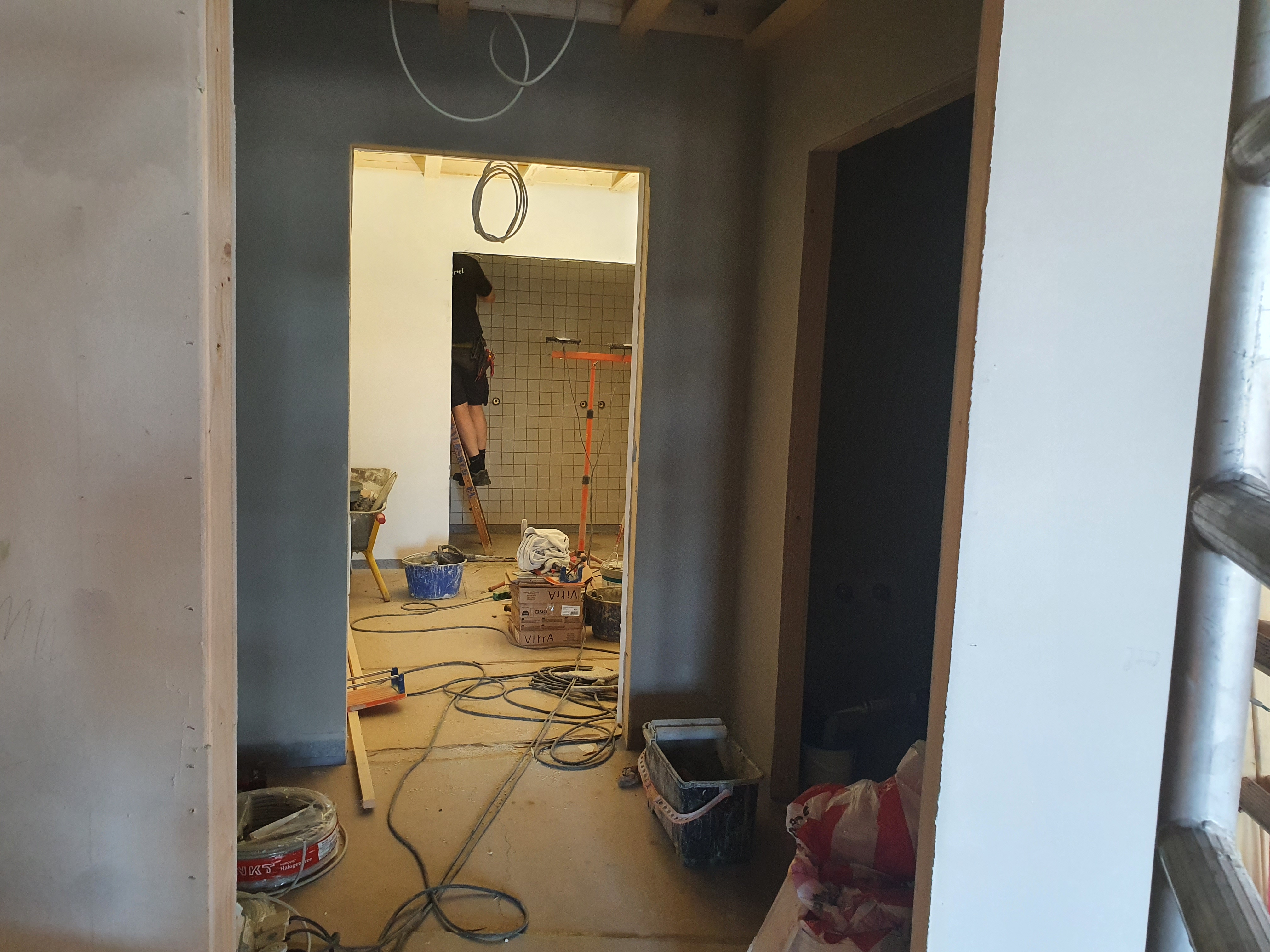 - 22. juni - det går stærkt nu. I dag kom der strøm på bygningen. Ventilationen kører også og vandet løber.