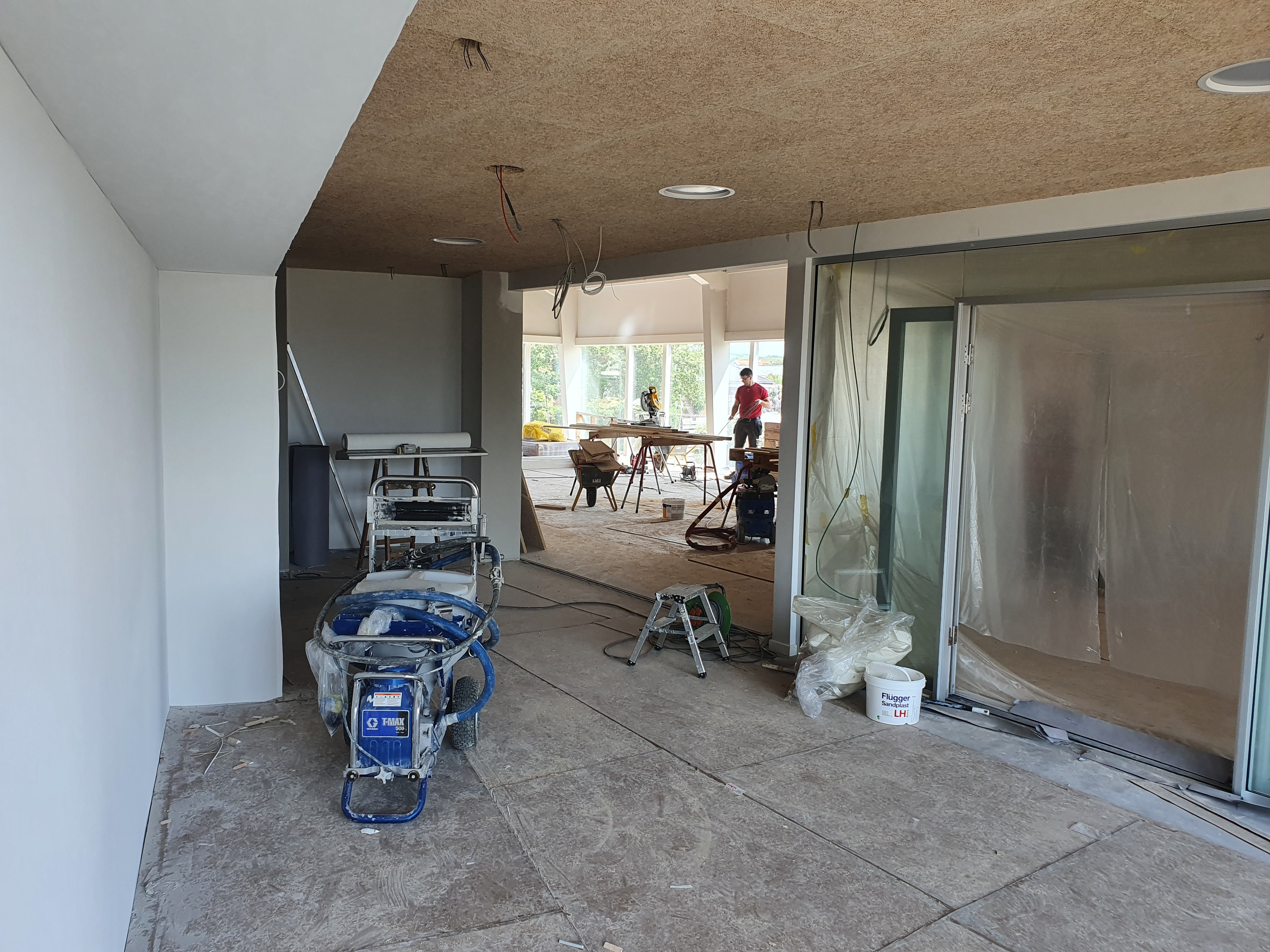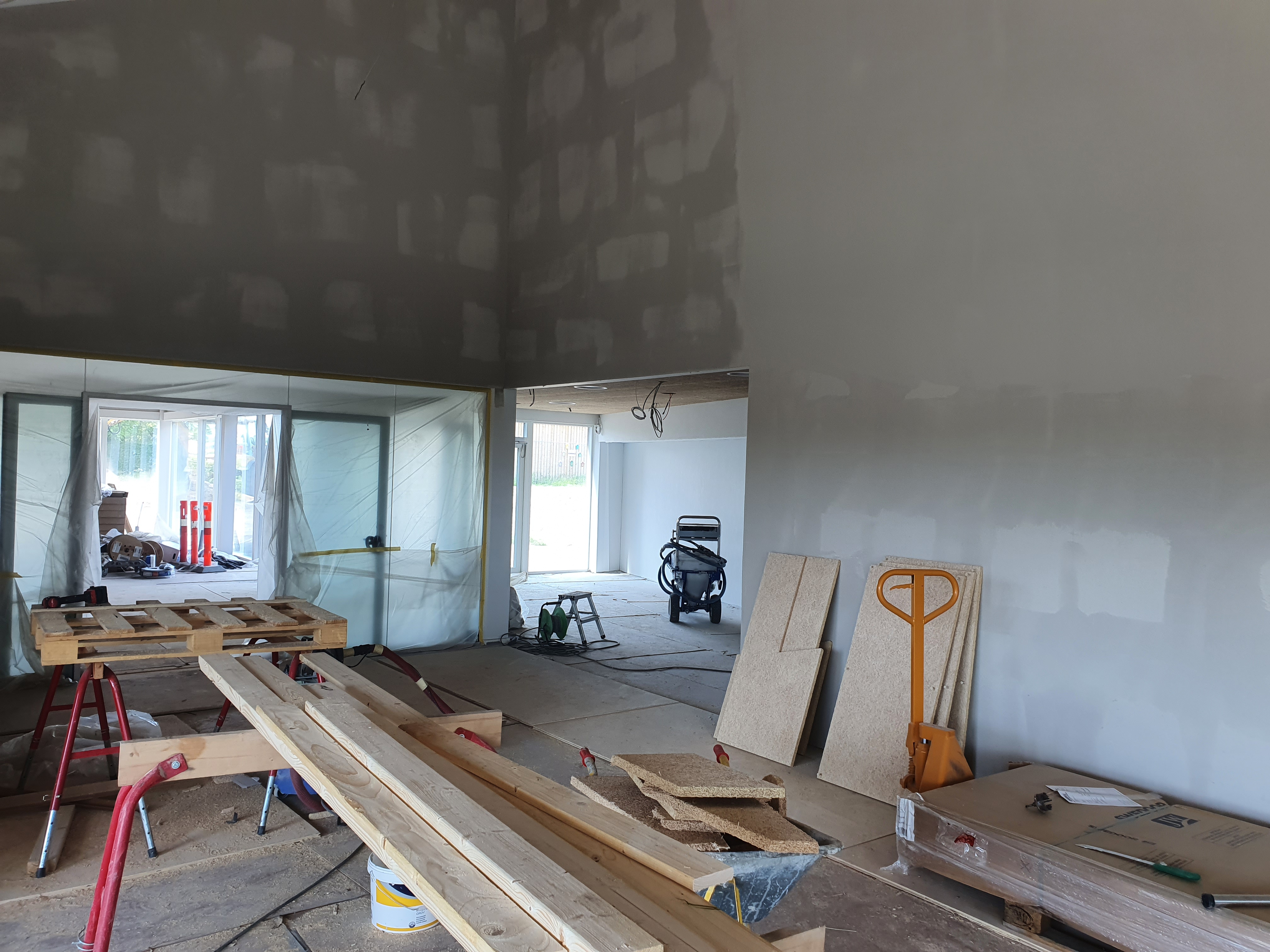- 18. maj - 4 uger til afleveringsdato. Stilladset er væk og der arbejdes på højtryk indvendigt. 10 - 12 håndværkere i gang samtidig.